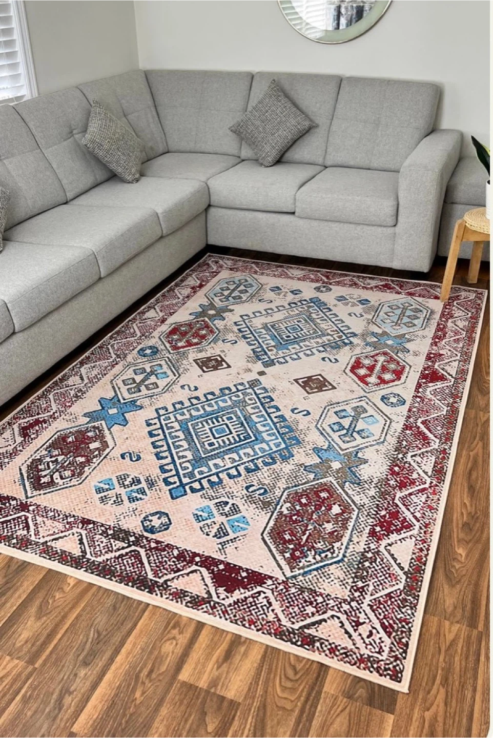 This area rug features an intricate Persian design. It has a beautiful mix of blues, reds, and cream tones. The rug's pattern would complement many home decor styles.