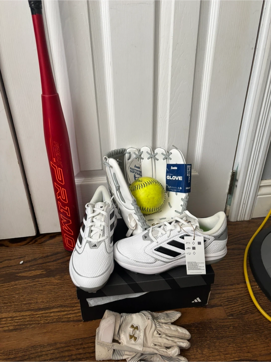 Softball Cleats, Bat, Gloves, and Ball