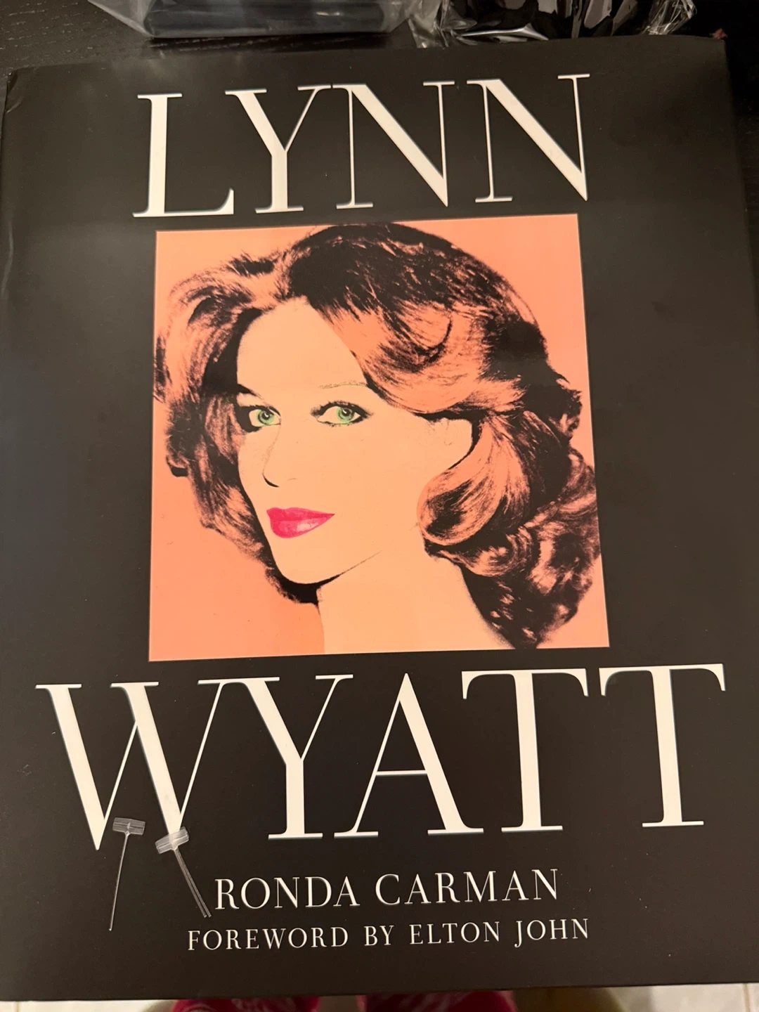 This is the book 'Lynn Wyatt' by Ronda Carman, with a foreword by Elton John. It features a portrait of Lynn Wyatt on the cover and includes an inscription on an inner page. The book is hardcover. One page is ripped so taped by clear tape.