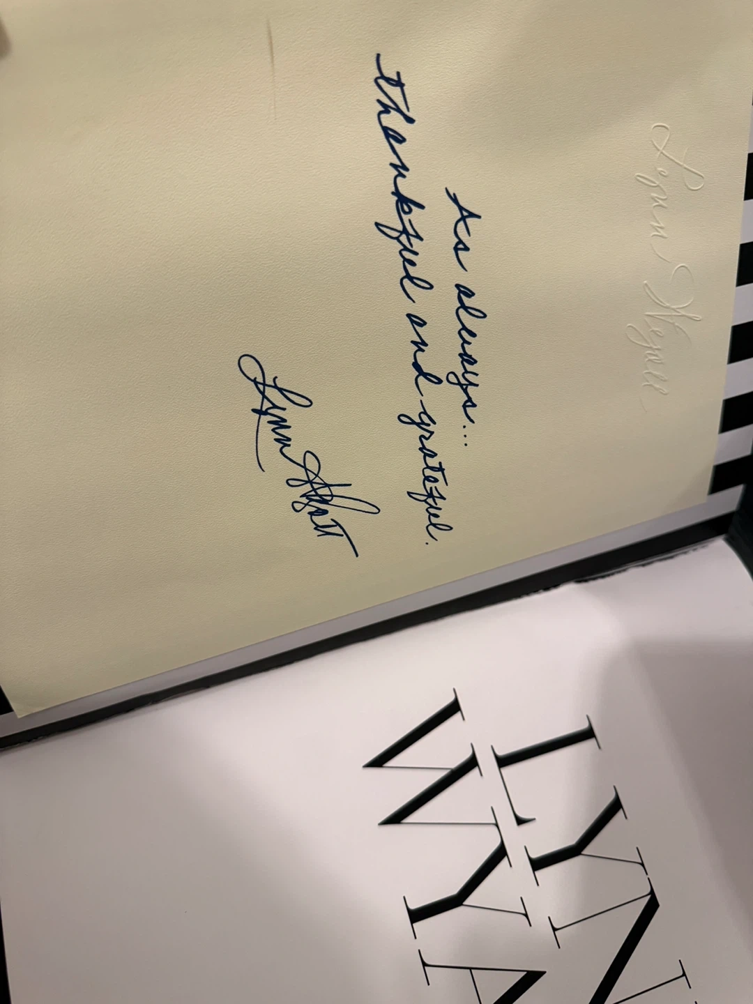 This is the book 'Lynn Wyatt' by Ronda Carman, with a foreword by Elton John. It features a portrait of Lynn Wyatt on the cover and includes an inscription on an inner page. The book is hardcover. One page is ripped so taped by clear tape.