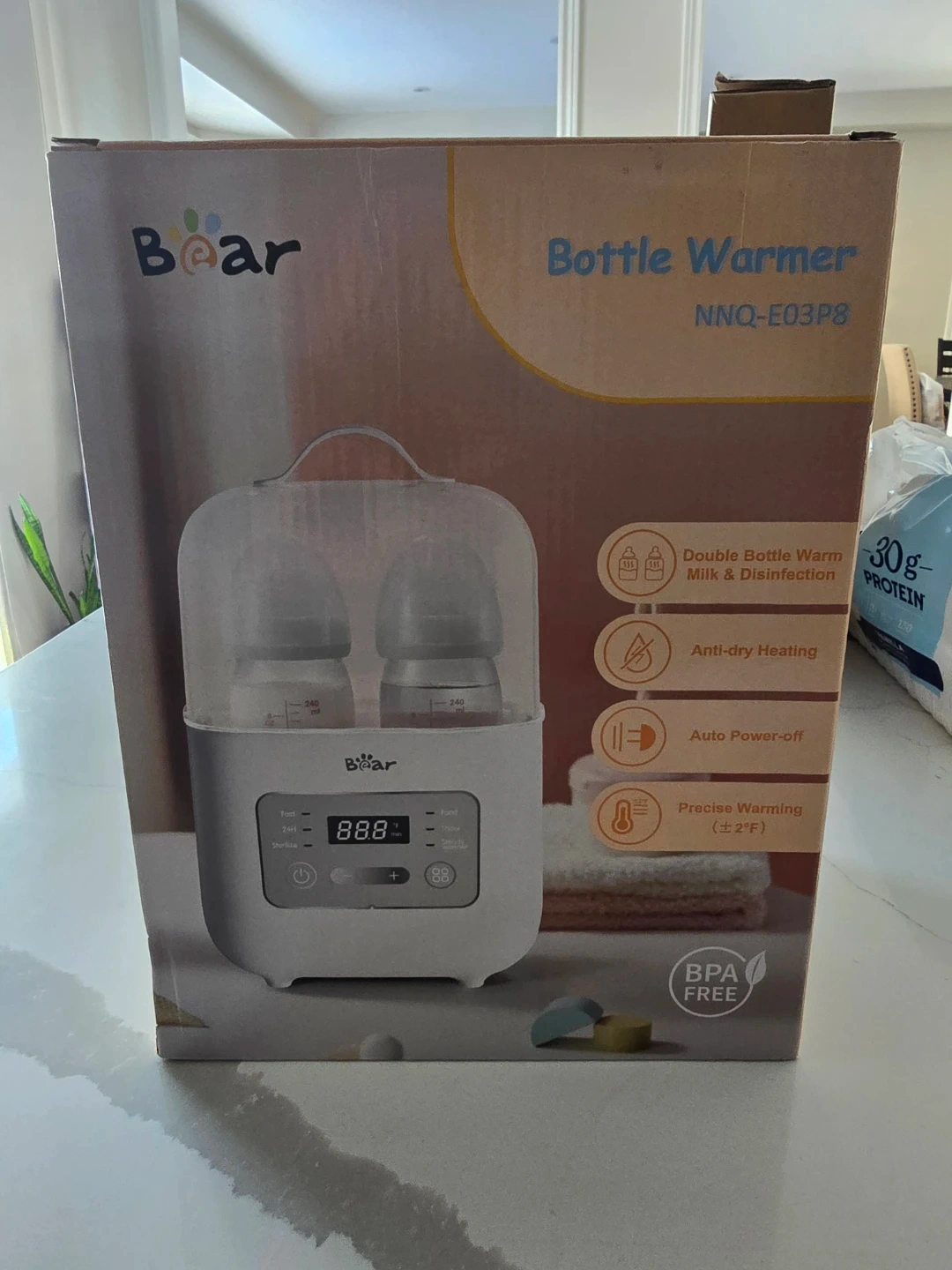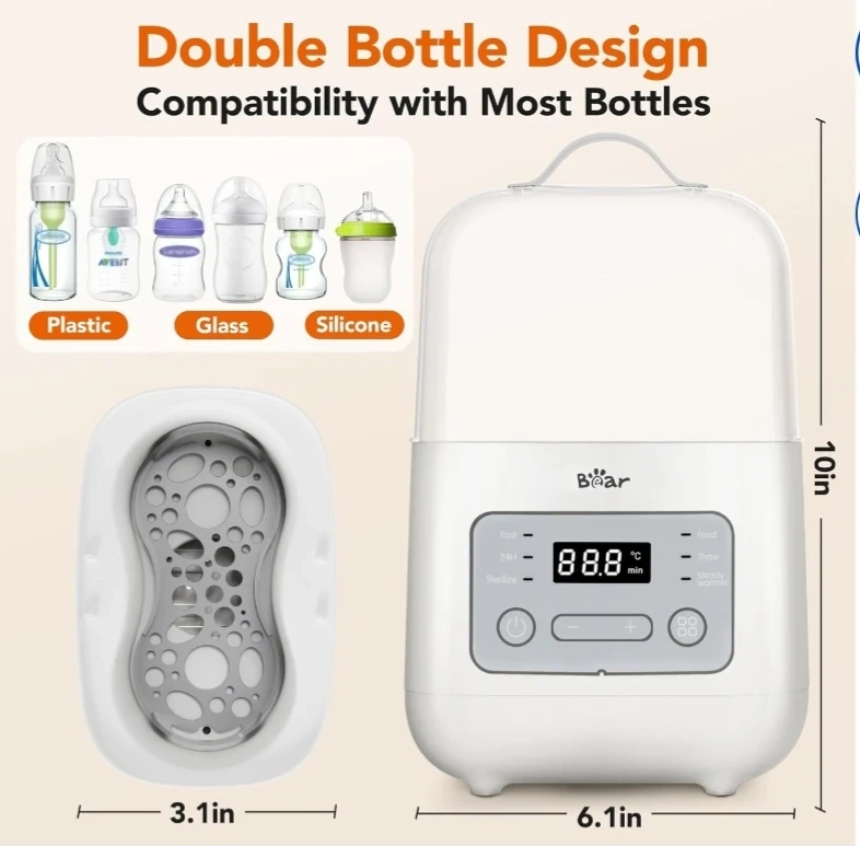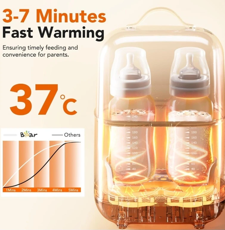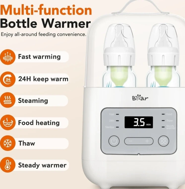 This Bear bottle warmer features double bottle capacity with fast warming and anti-dry heating. It offers precise temperature control for warming, steaming, and sterilizing. This multi-function warmer ensures convenient feeding for parents.