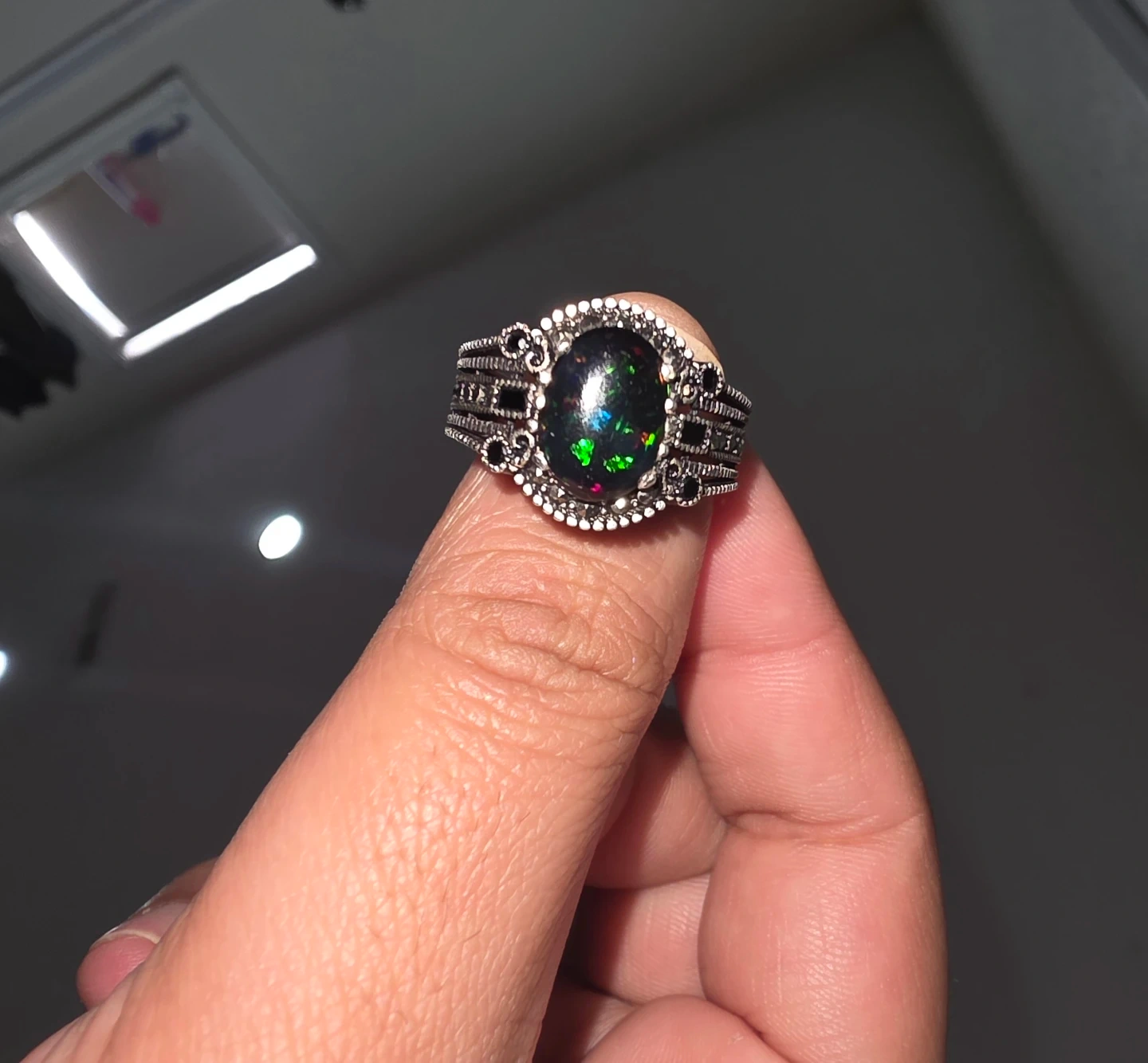 This is a striking ring with a green opal gemstone, set in a detailed silver-toned band. It features intricate patterns along the sides and small accent stones surrounding the main gem. This piece would make a great statement accessory!