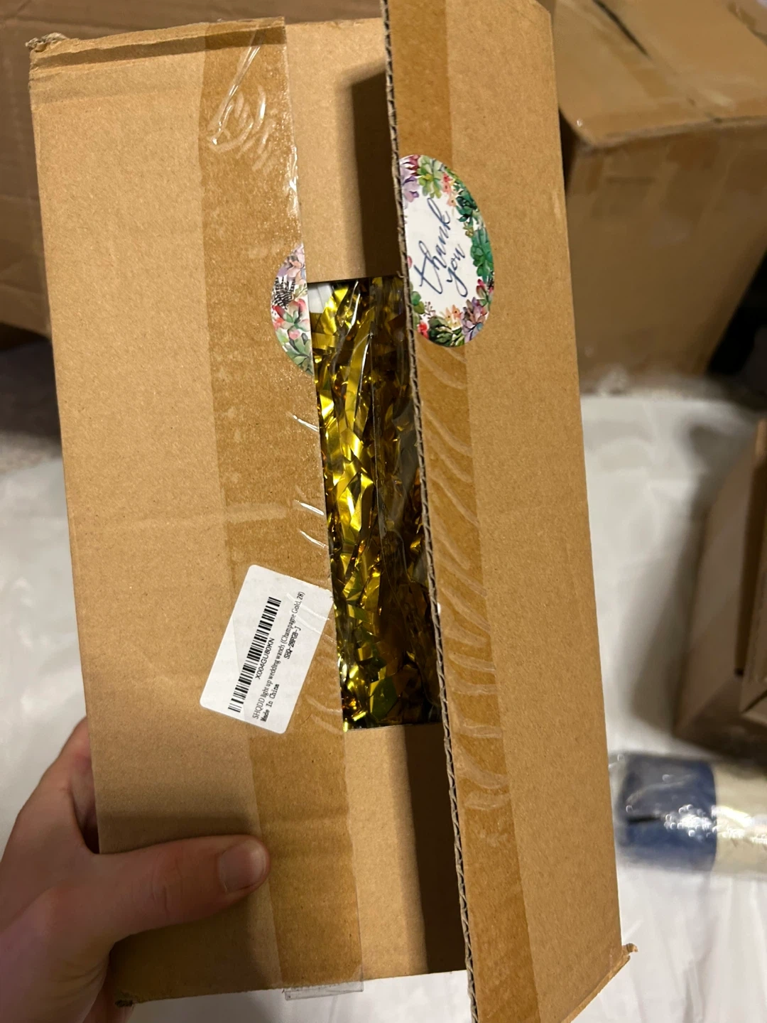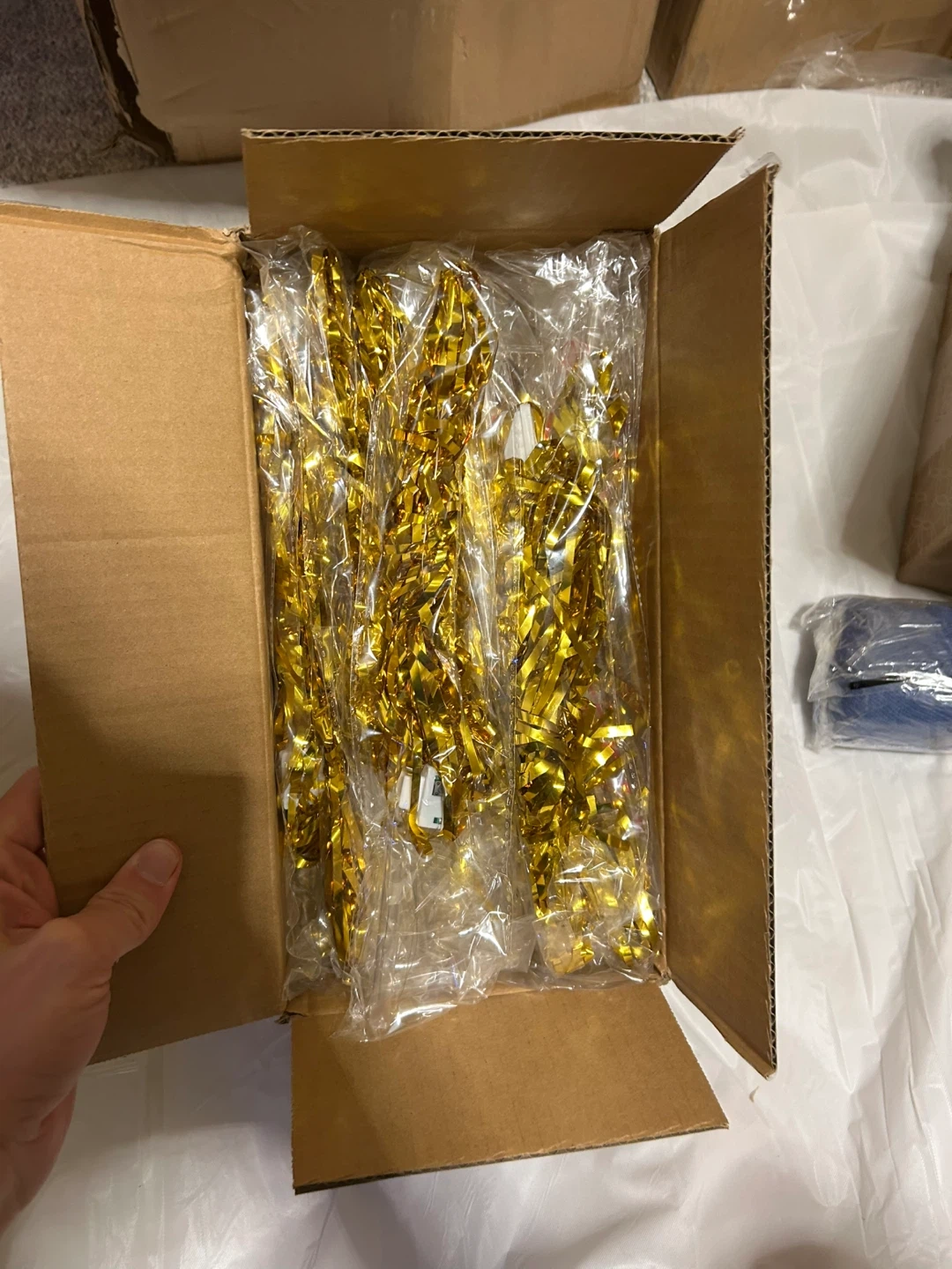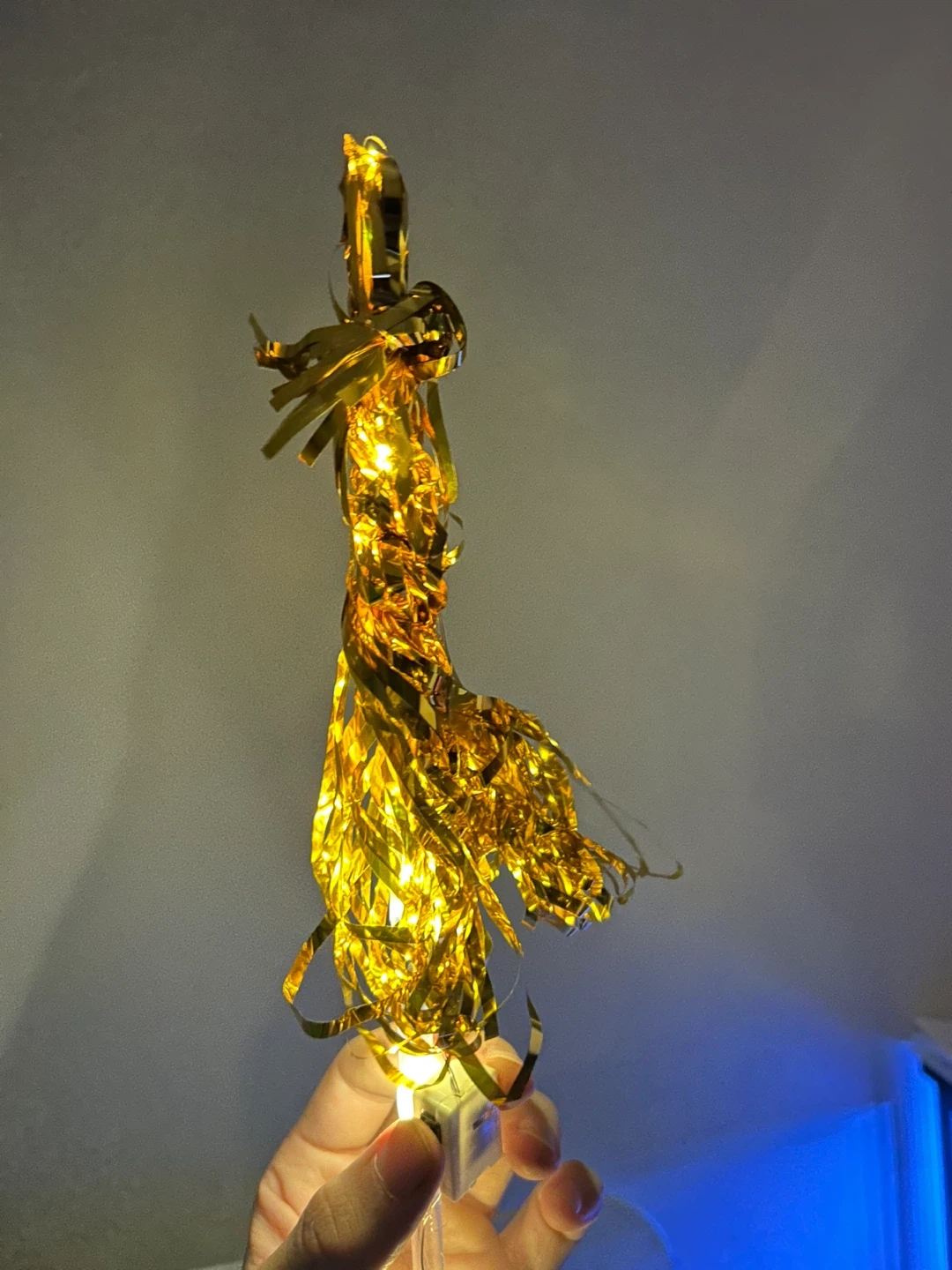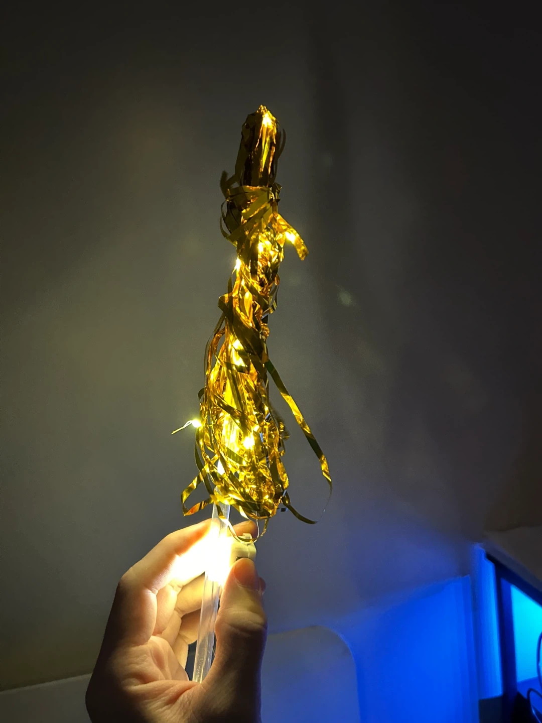 Includes a box of gold tinsel light-up wands. Each wand is individually wrapped for protection. They're shiny and bright, perfect for parties or events!