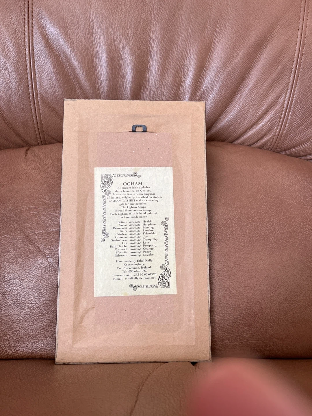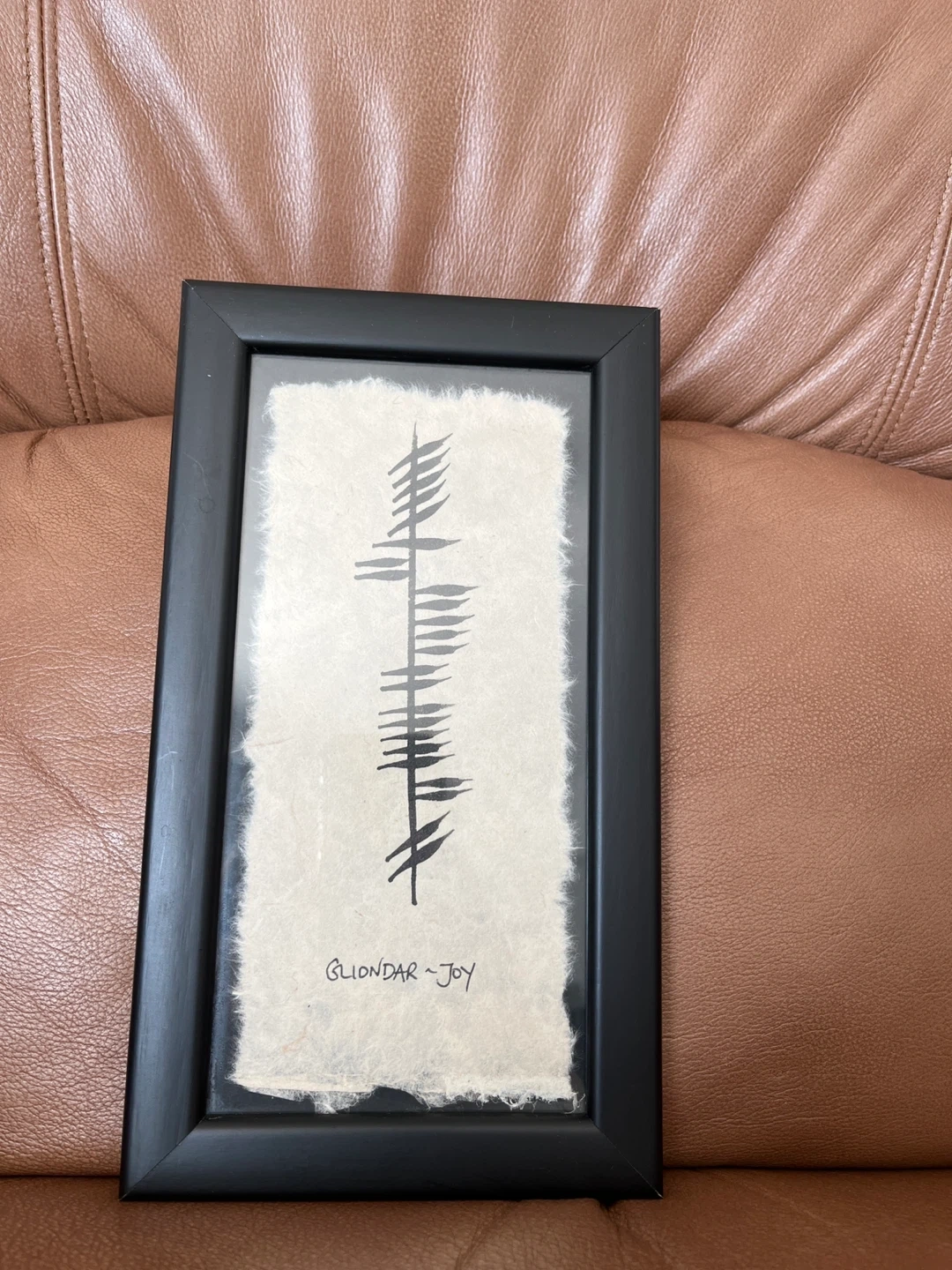 This framed print features Ogham art, an ancient Irish alphabet, with the symbol Gliondar meaning Joy. It's a unique piece of wall decor that celebrates Irish heritage. The print is encased in a black frame, ready to be hung.
