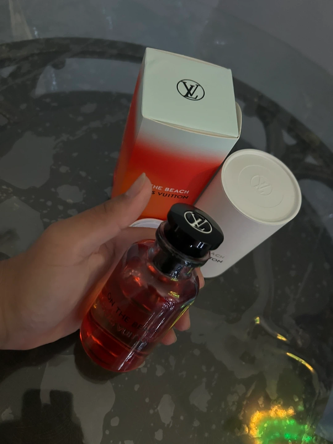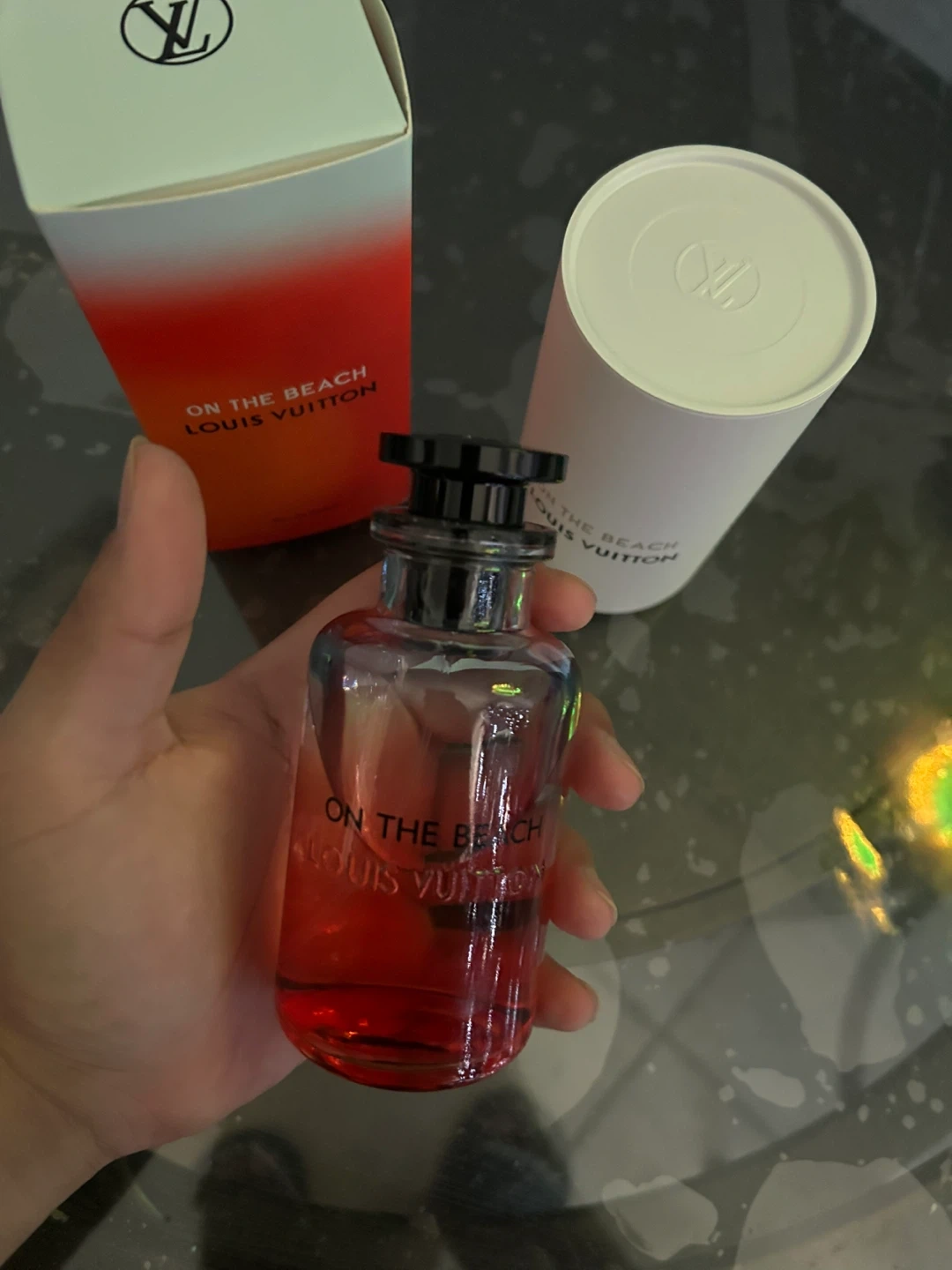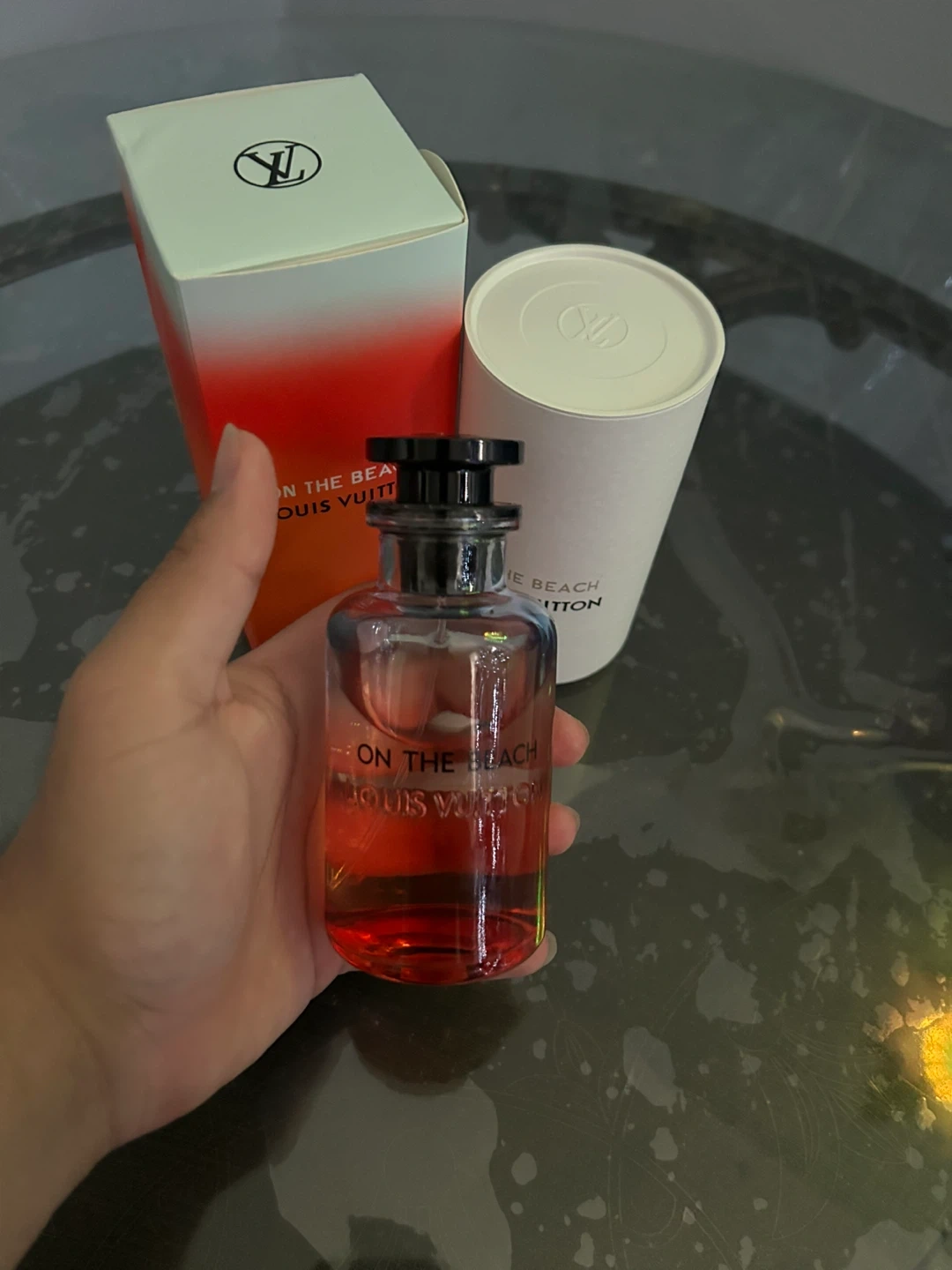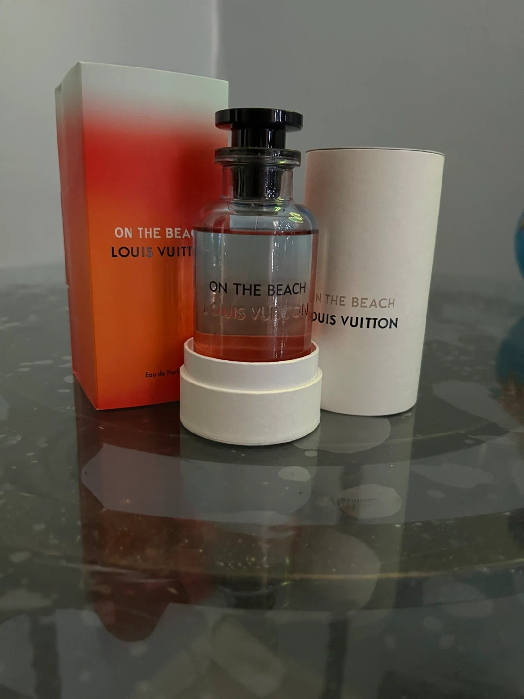 Louis Vuitton "On The Beach" Eau de Parfum. This fragrance comes in a 100ml bottle with its cylindrical case. It's a vibrant scent perfect for both warm and cold weather.