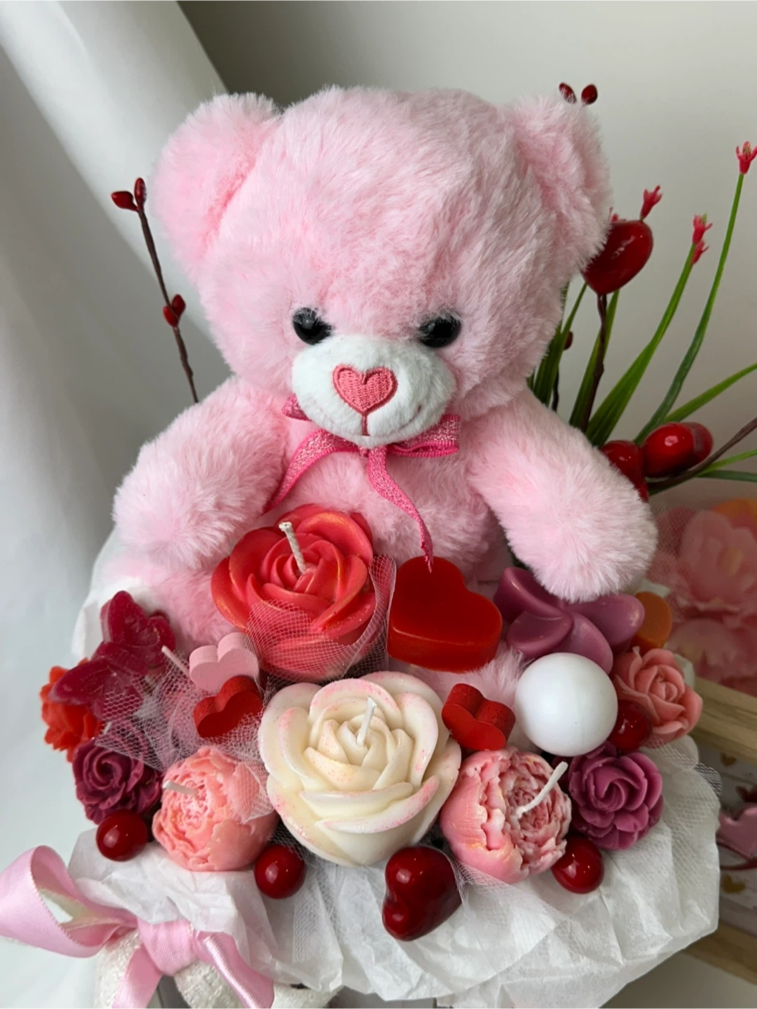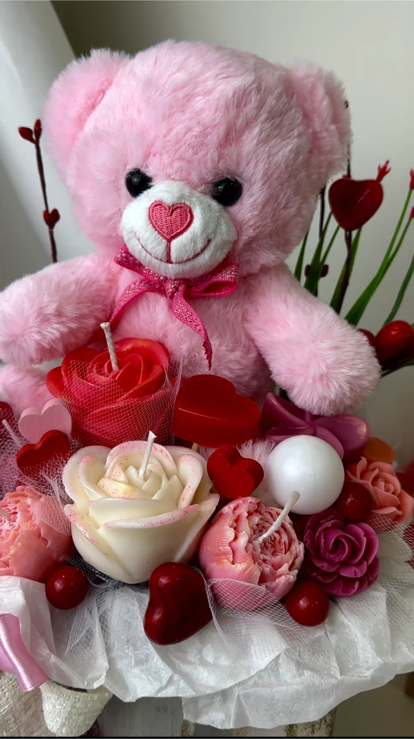 A bouquet of decorative candles in the shape of flowers and hearts with a cute pink teddy bear.