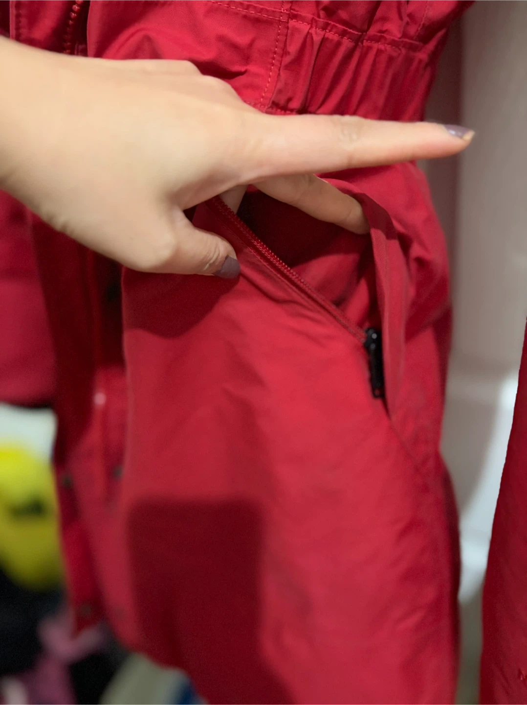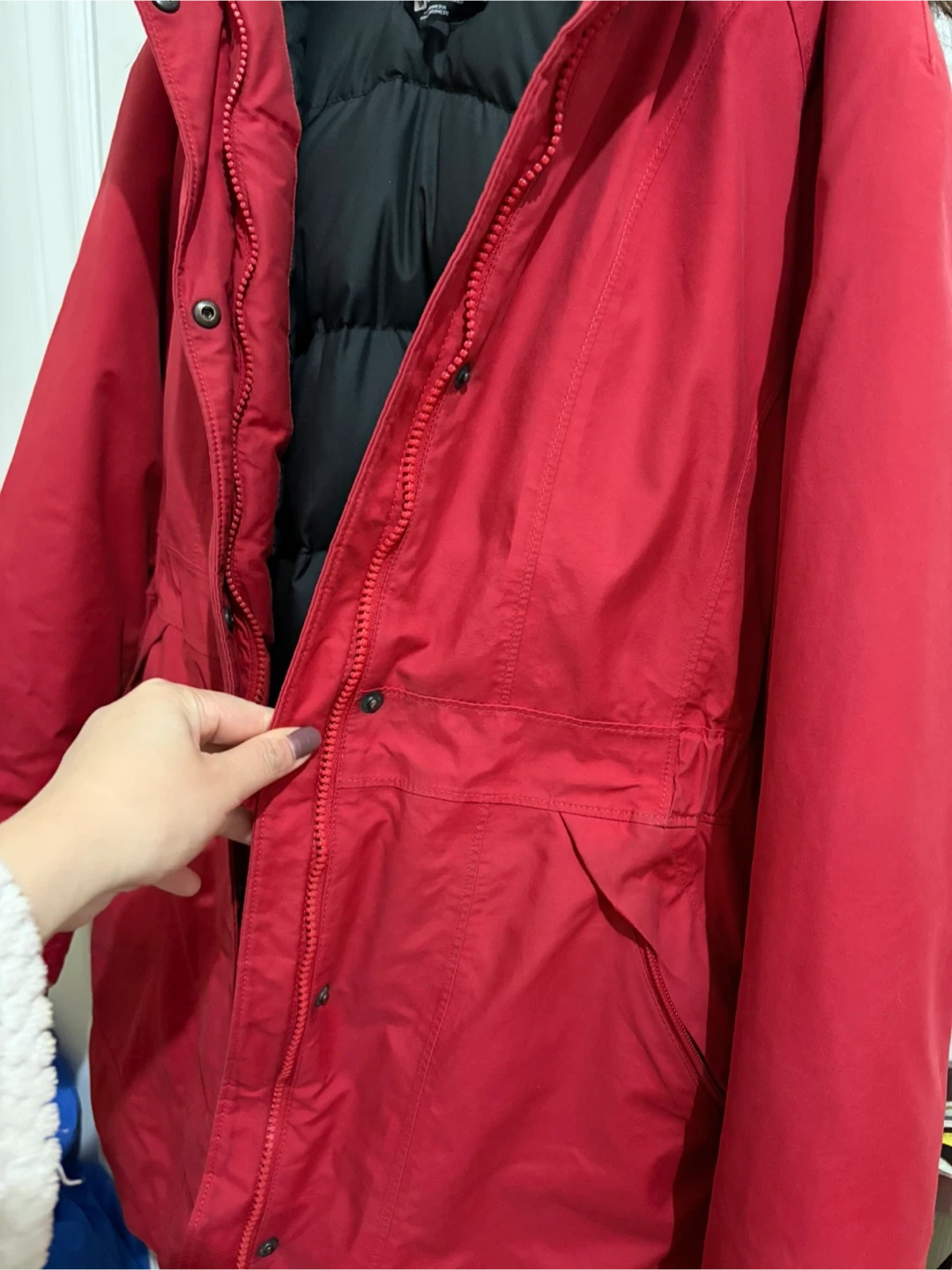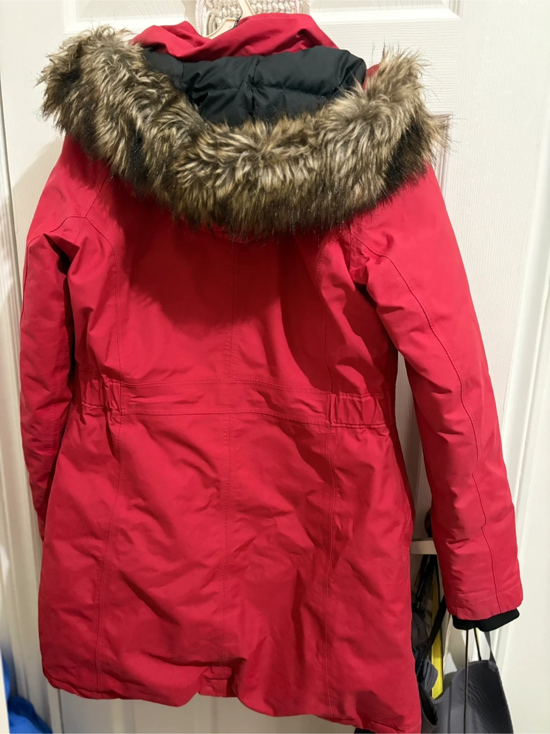 Warm red parka jacket from The North Face. It's insulated for cold weather and features a detachable fur-lined hood. Plenty of pockets for storage.