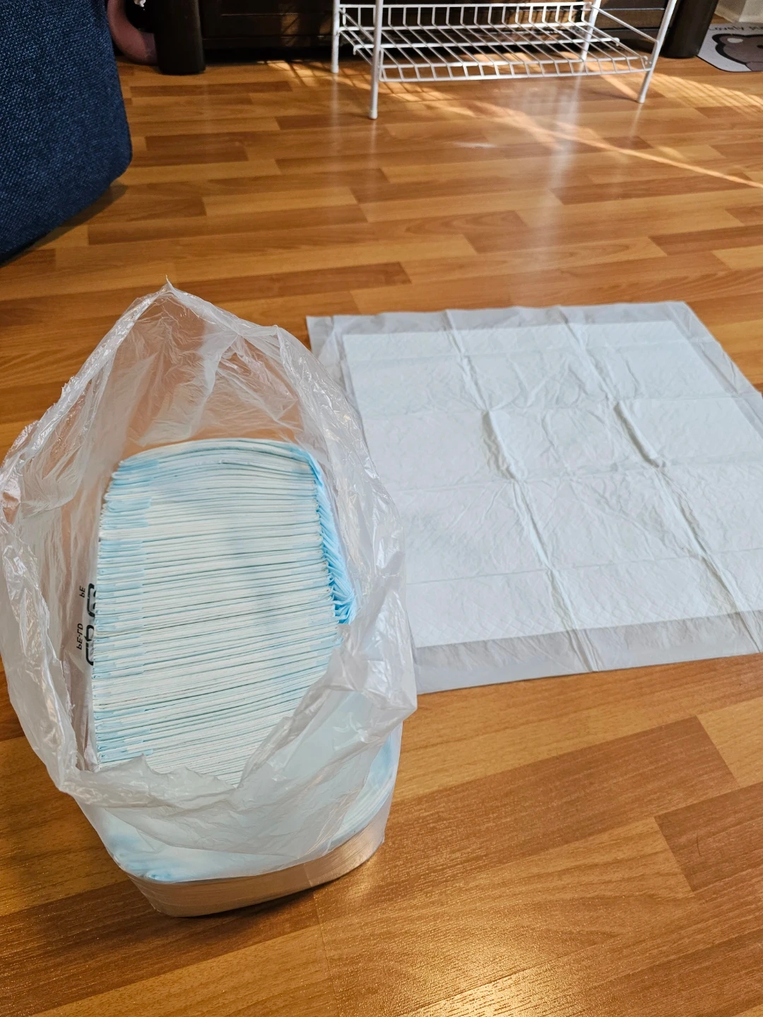 A stack of pet training pads with blue accents visible. One pad is laid out separately. These pads are great for house-training pets or for use in crates.