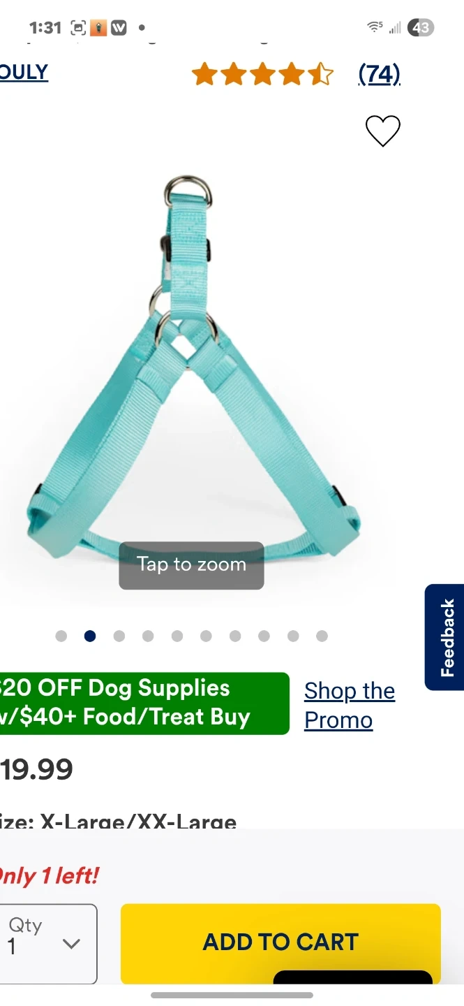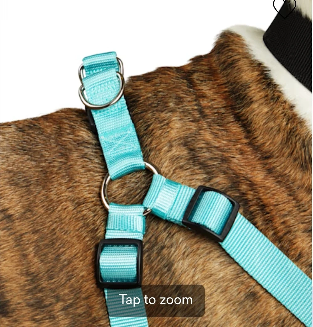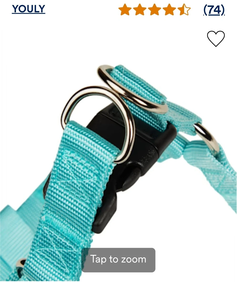 This is a YOULY dog harness in a bright aqua color. It's made from durable nylon webbing and features metal D-rings for leash attachment. The harness has adjustable straps and a quick-release buckle for a secure fit. It also includes a paw print logo tag.