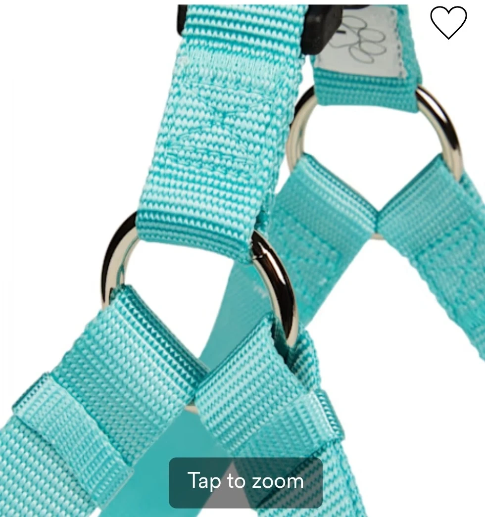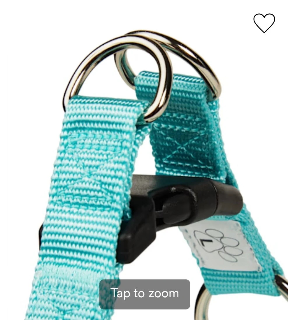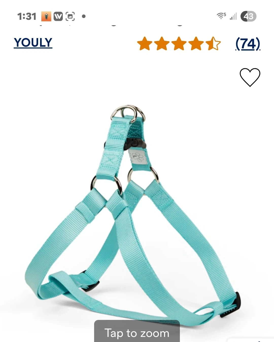 This is a YOULY dog harness in a bright aqua color. It's made from durable nylon webbing and features metal D-rings for leash attachment. The harness has adjustable straps and a quick-release buckle for a secure fit. It also includes a paw print logo tag.