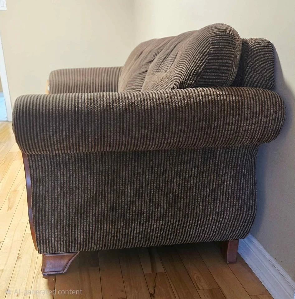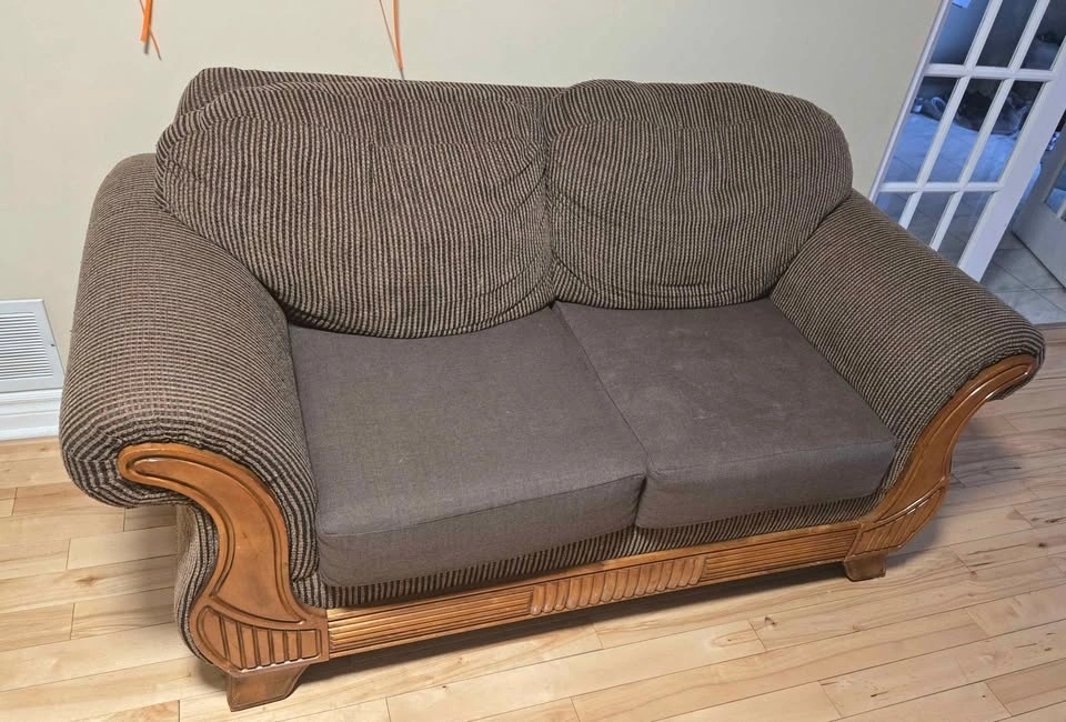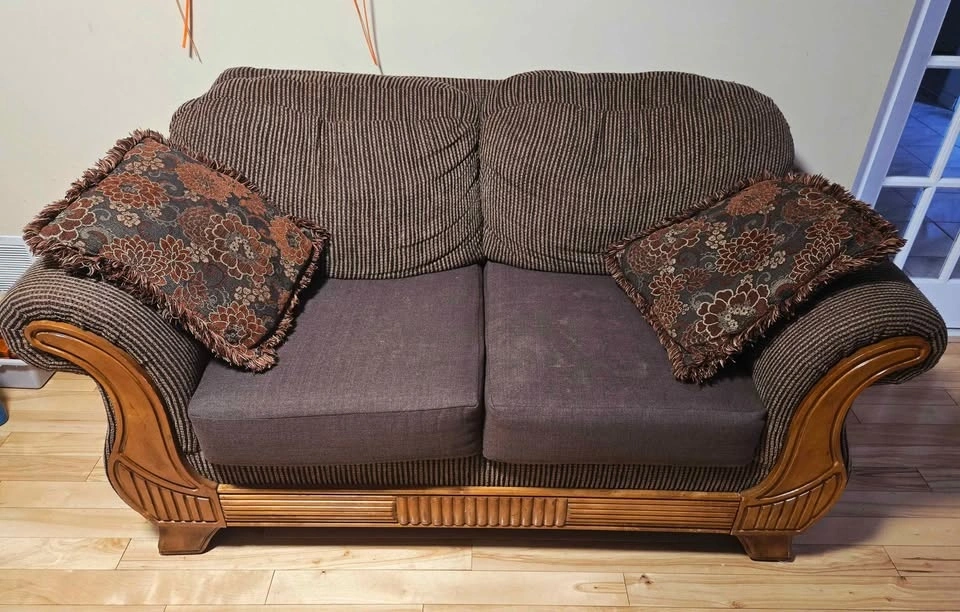 Comfy brown sofa set with a striped fabric and dark brown seat cushions. Features wood accents on the arms and base. Includes a 3-seater sofa and two matching 2-seater loveseats, for a total of 3 pieces. Also comes with custom, removable, and washable seat covers and matching pillows.