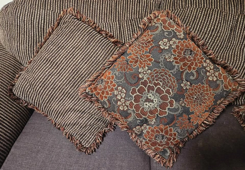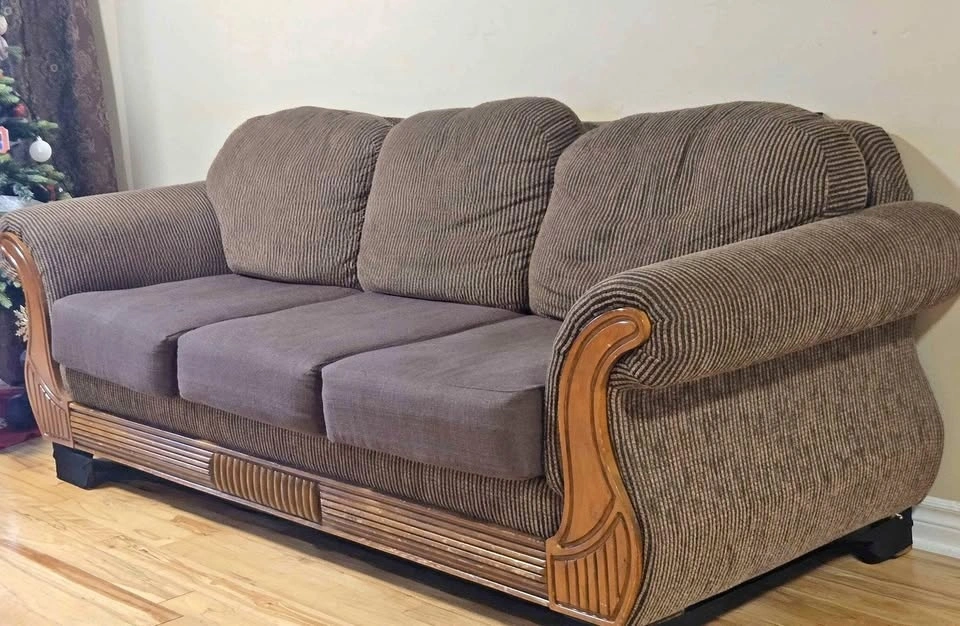 Comfy brown sofa set with a striped fabric and dark brown seat cushions. Features wood accents on the arms and base. Includes a 3-seater sofa and two matching 2-seater loveseats, for a total of 3 pieces. Also comes with custom, removable, and washable seat covers and matching pillows.