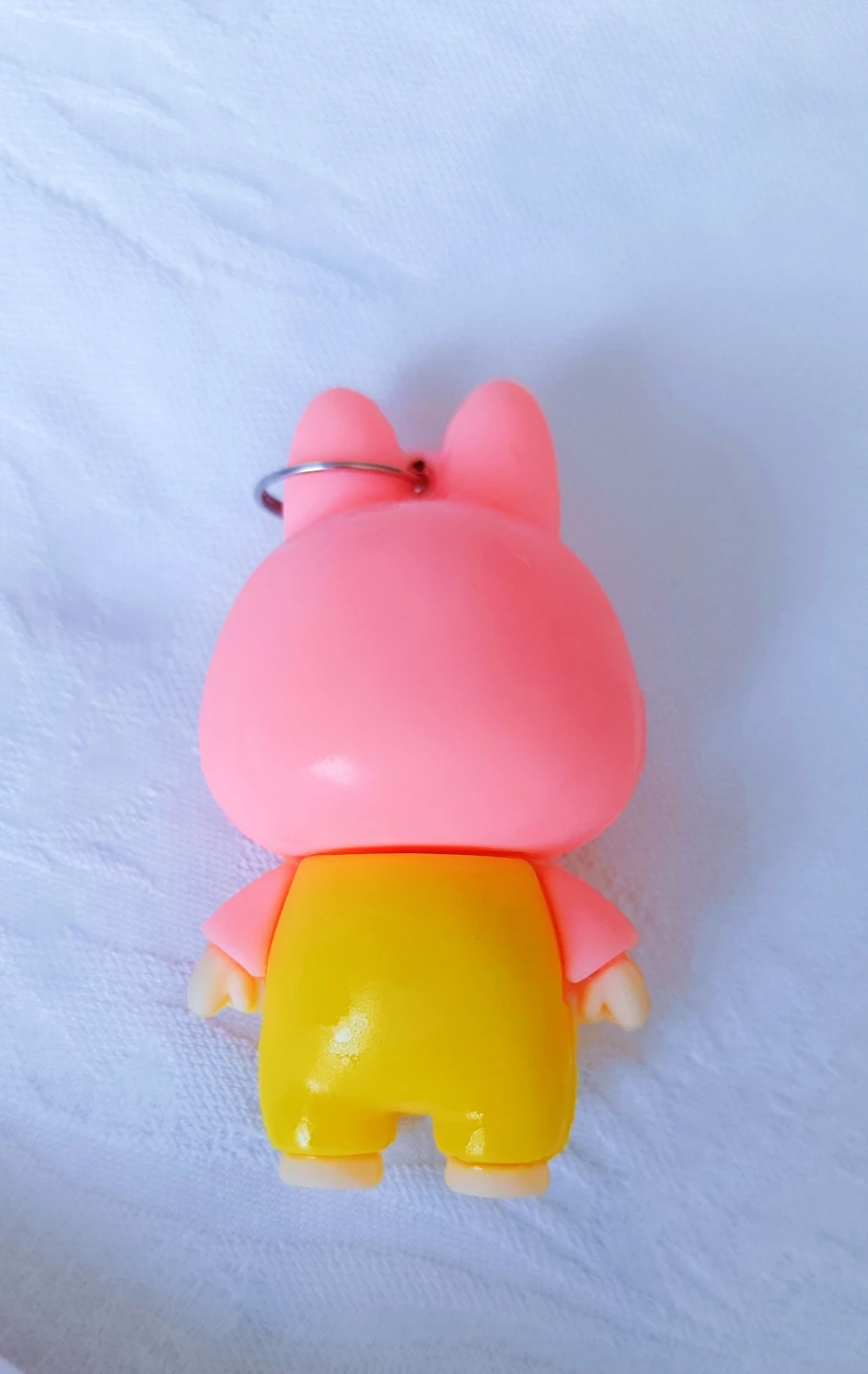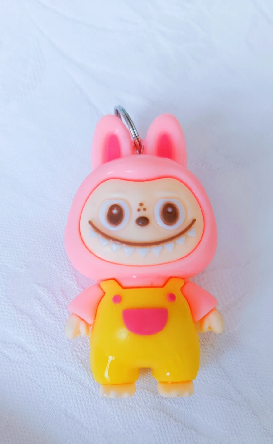 A cute character keychain. It's pink with yellow overalls and has a friendly, slightly mischievous face. Great for adding a bit of fun to your keys or backpack!