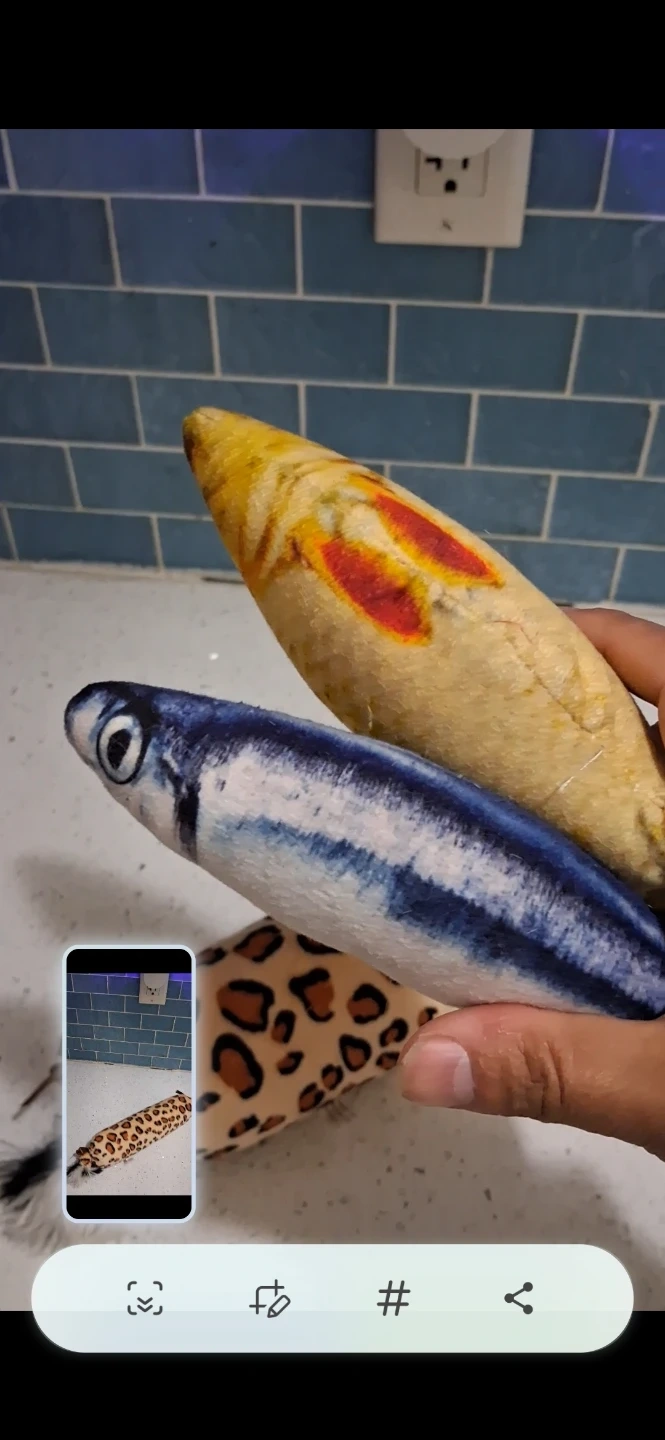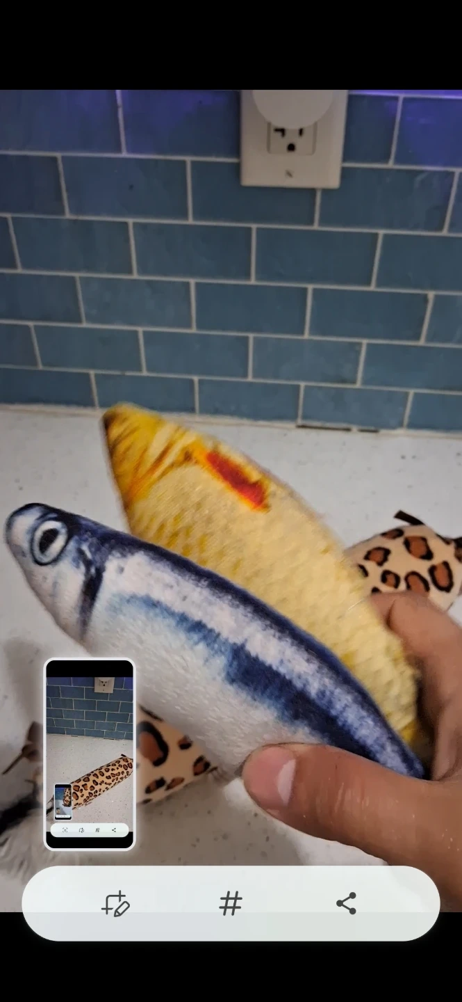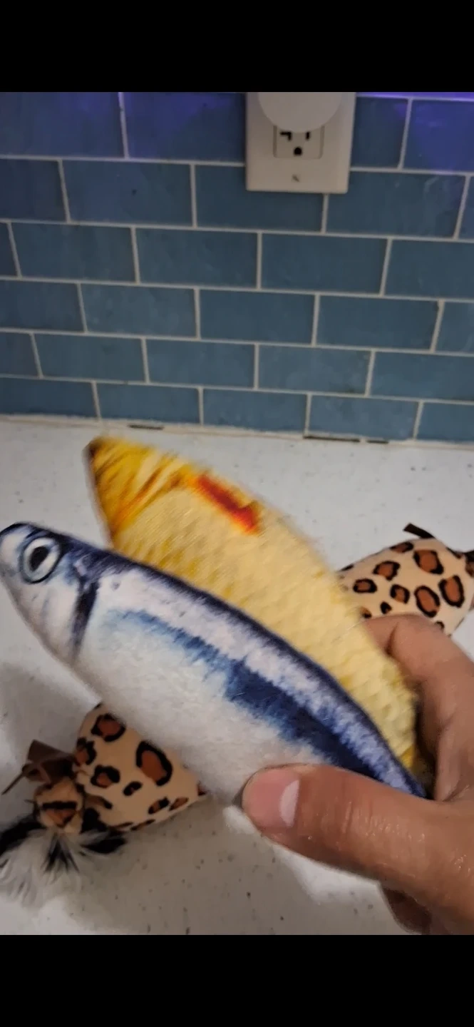 Set of three plush fish toys designed for cats. Each fish has a realistic design with vibrant colors and markings. Includes one with blue and white stripes, and one yellow with red accent. Perfect for engaging your cat's hunting instincts with durable material for playtime!
