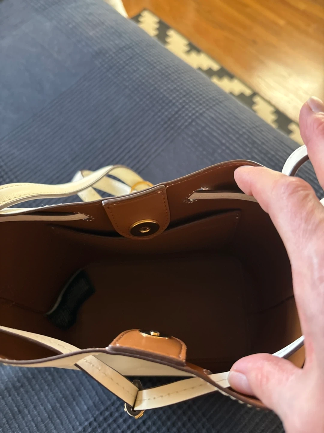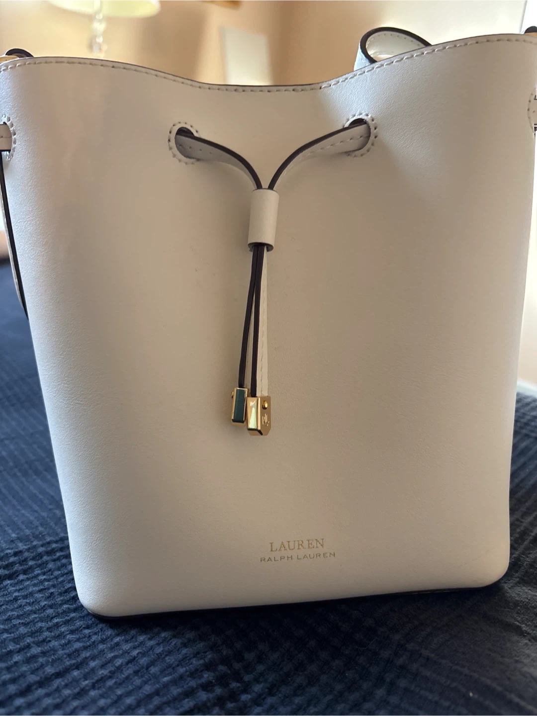 This is a white bucket bag by Lauren Ralph Lauren. It's made of leather with gold-tone hardware and a drawstring closure. Interior includes a slip pocket.