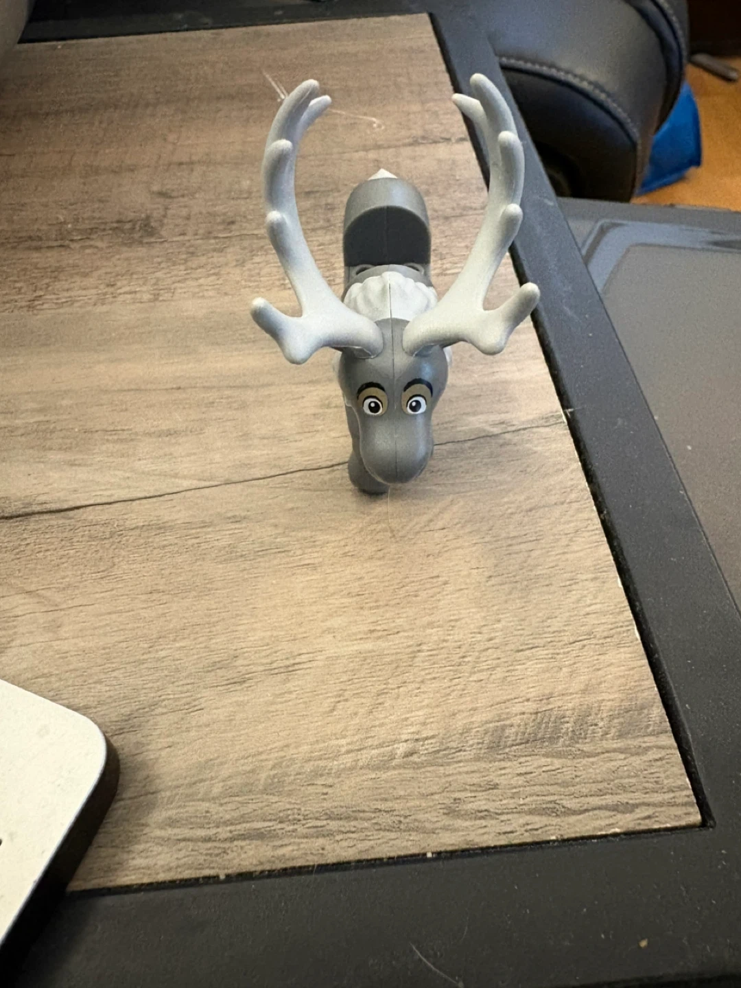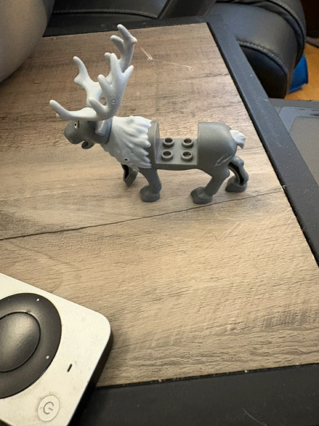 LEGO reindeer figure. This grey plastic toy has large antlers and detachable hindquarters. It's part of a LEGO buildable set.