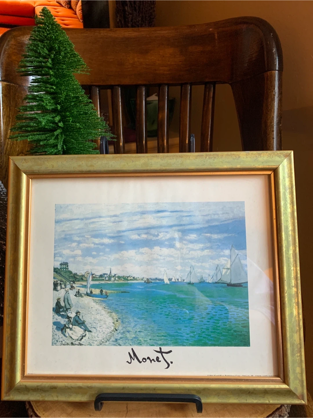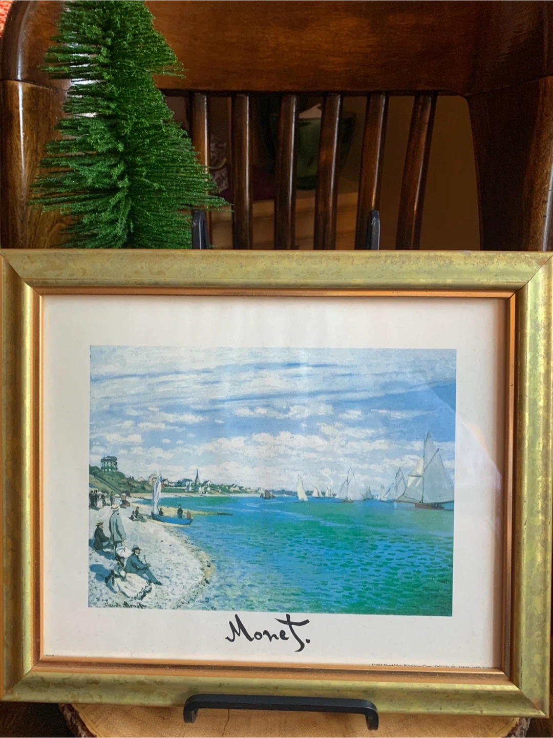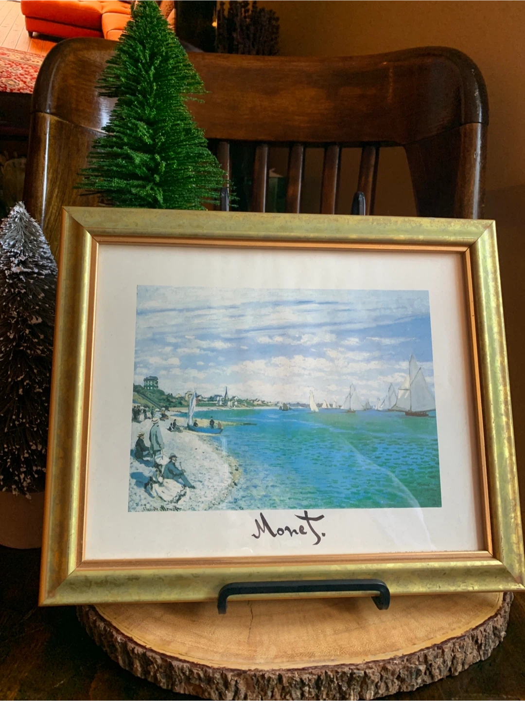 This framed vintage print showcases Claude Monet's famous Impression, “Regatta at Sainte- Addresse” painting from 1867. It's in a gold-toned frame with a caramel coloured border behind the gold. The print is from NorthWest Publishing Corp. dated 1994. It's ready to hang and would add a touch of classic art to any room!
