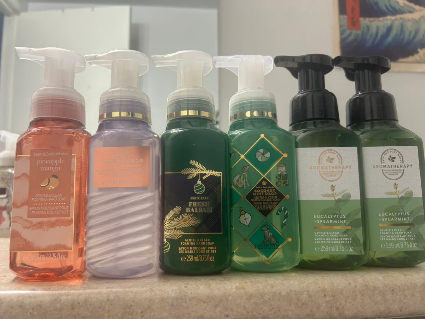Six Brand New Bath & Body Works foaming hand soaps. Scents are Pineapple Mango, Sweet Sandalwood, Fresh Balsam, Coconut Mint Drop, and two Eucalyptus + Spearmint. Each bottle is 259 ml or 8.75 fl oz.