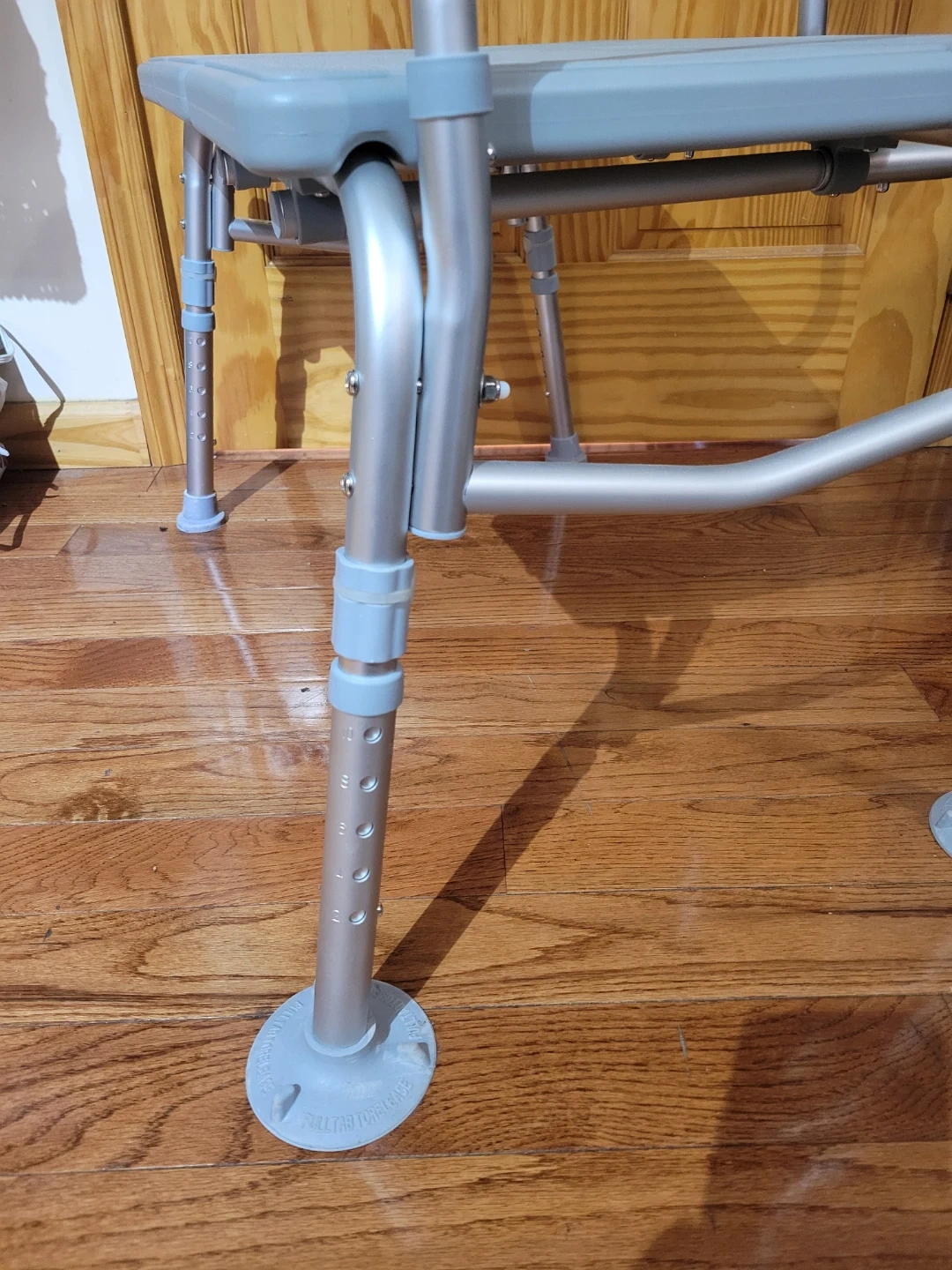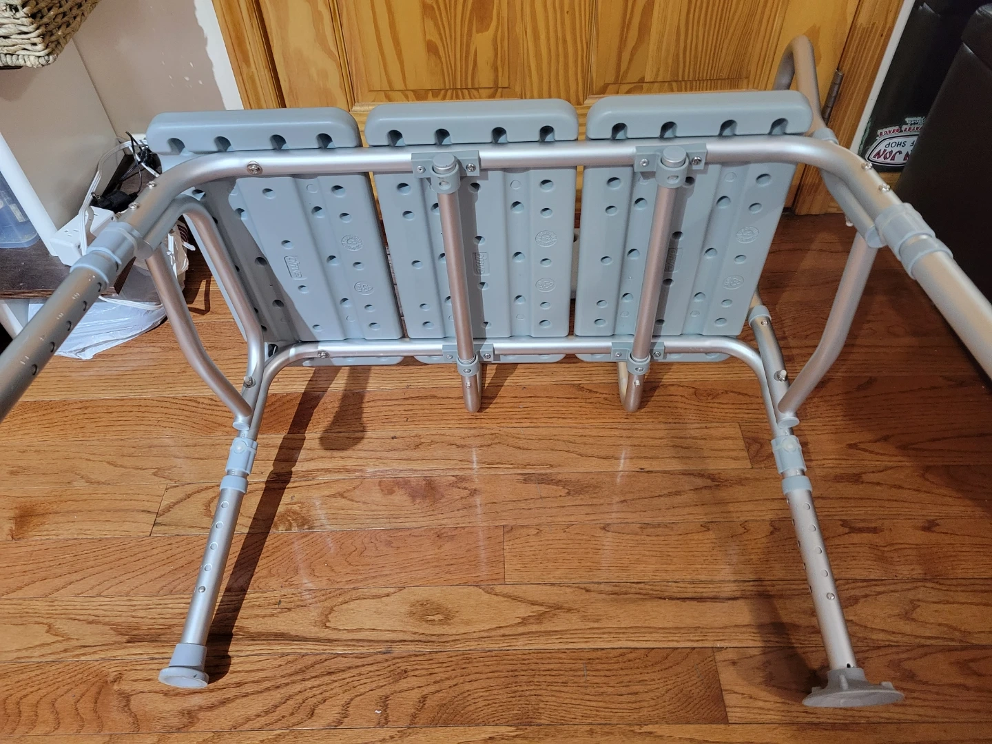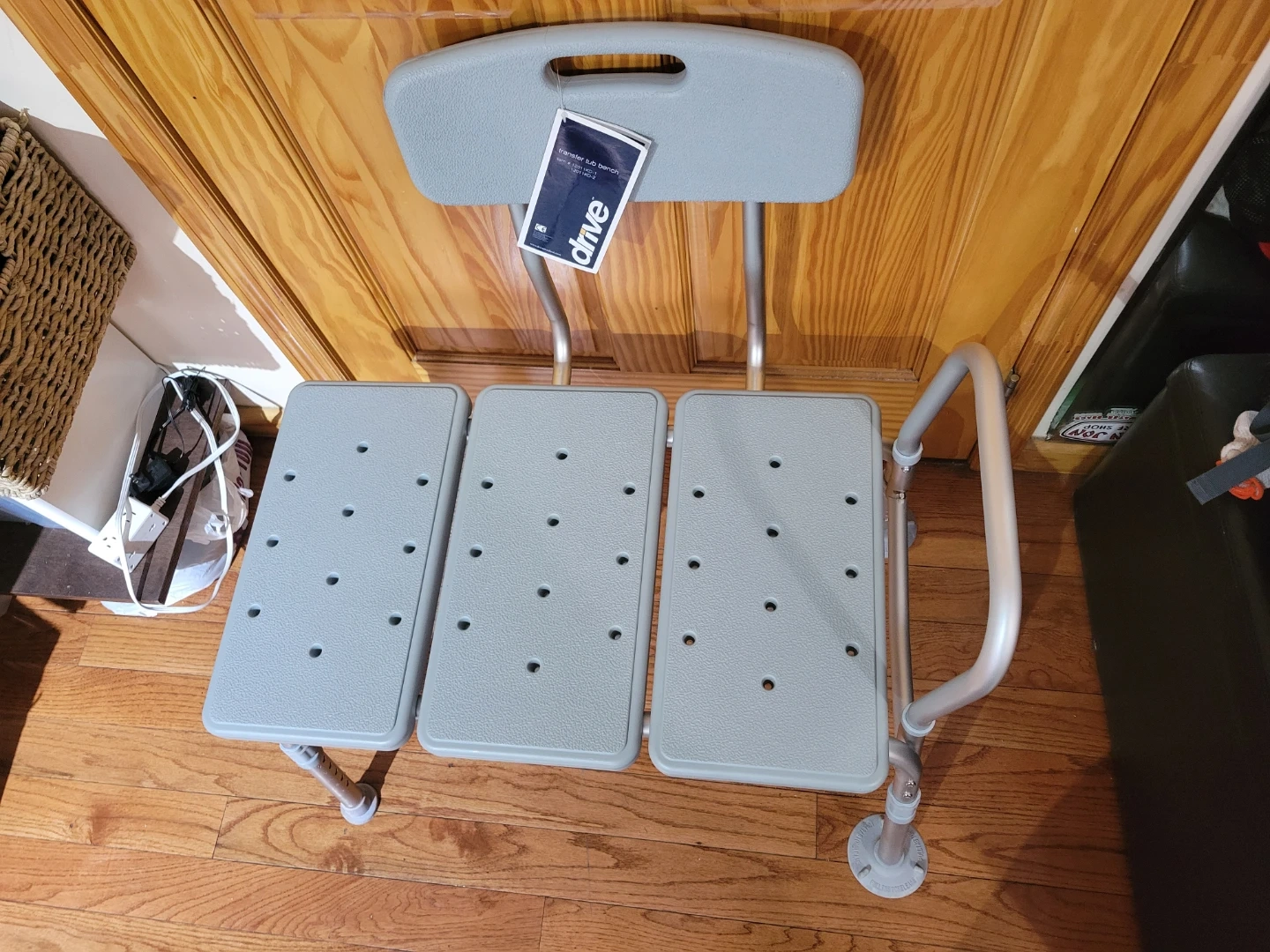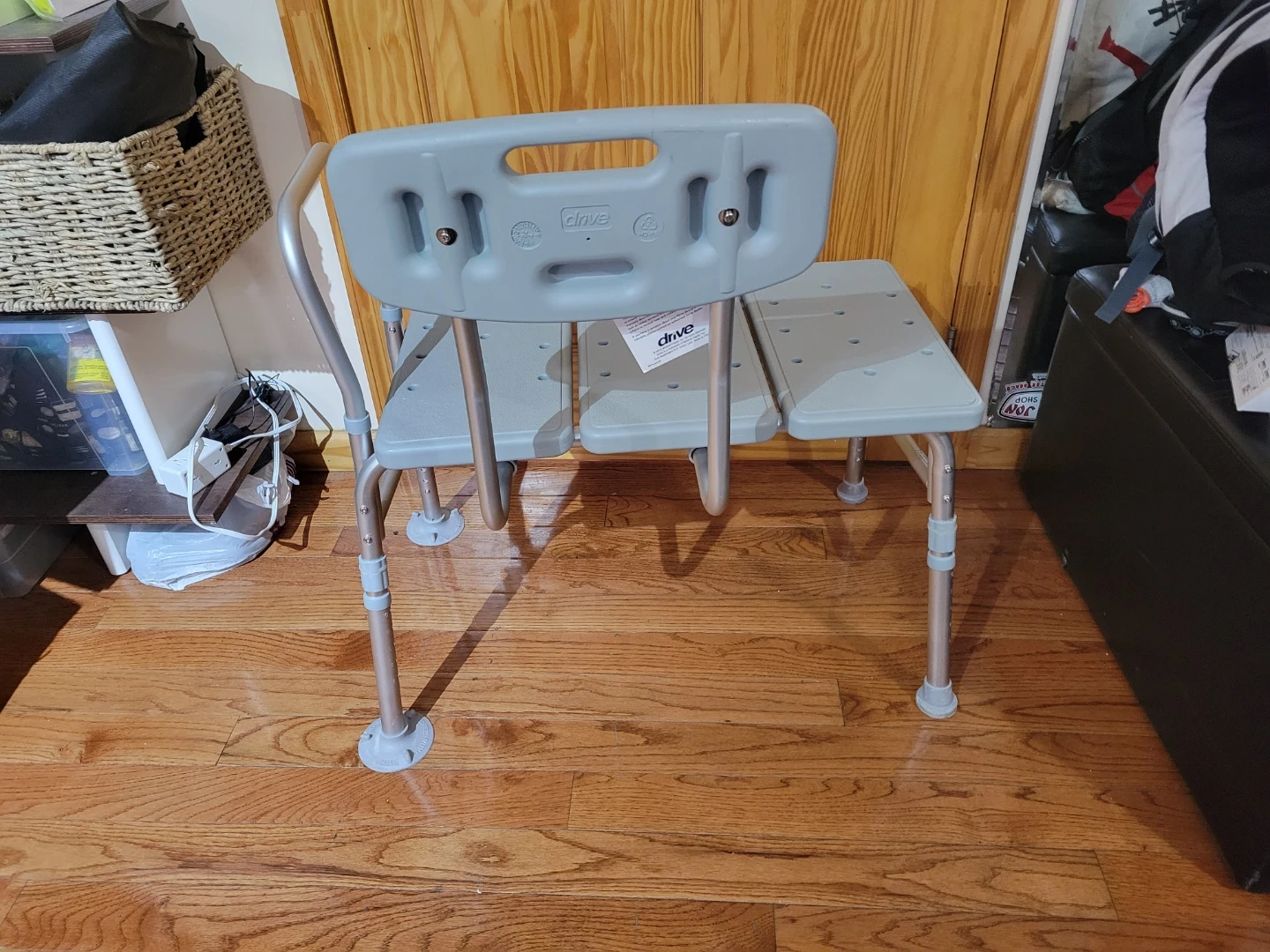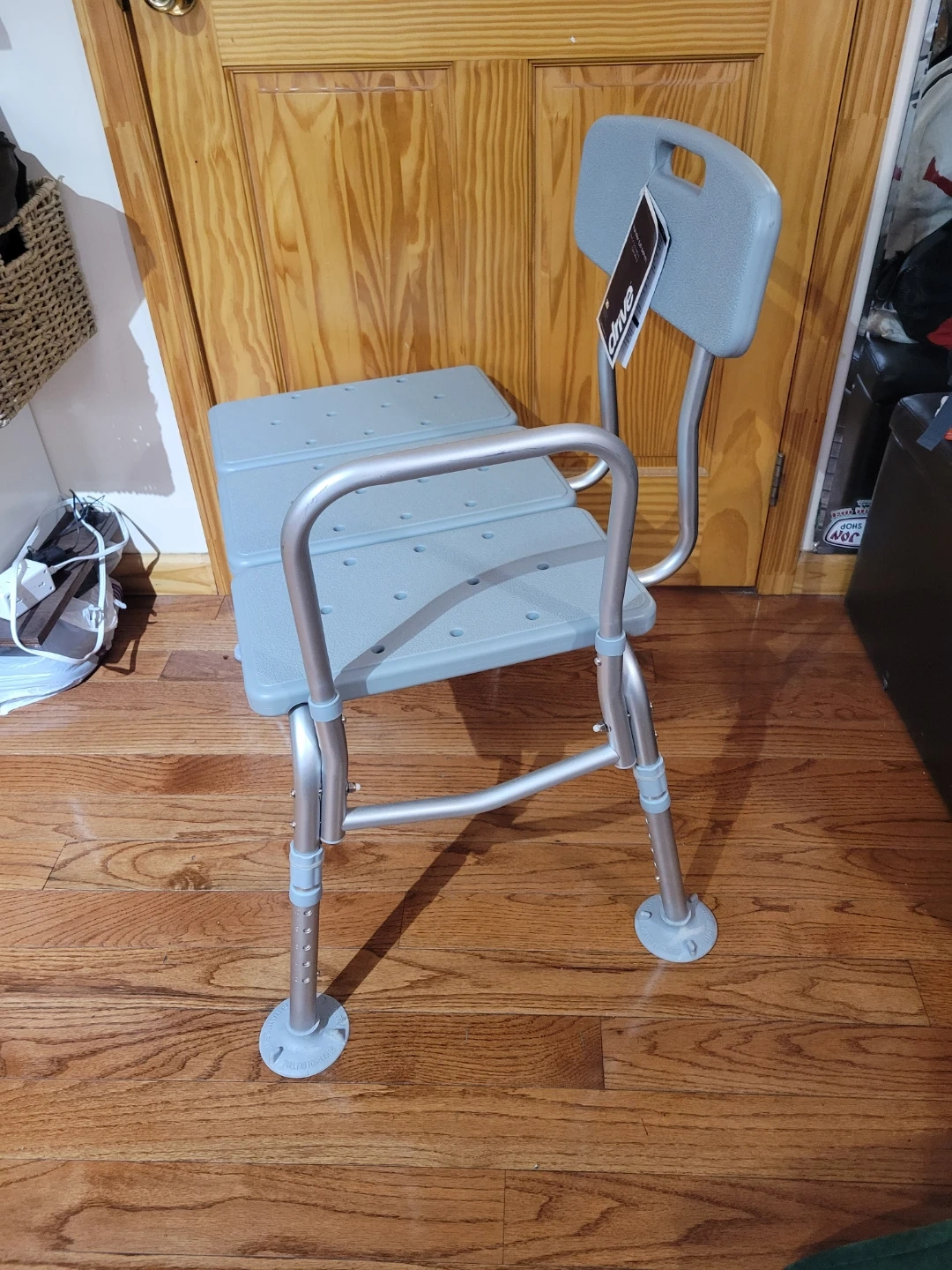 This is a Drive Medical bath transfer bench with a back and armrest. It's made of durable plastic and aluminum. The seat has drainage holes and the legs are adjustable. It provides stability in the shower or tub!