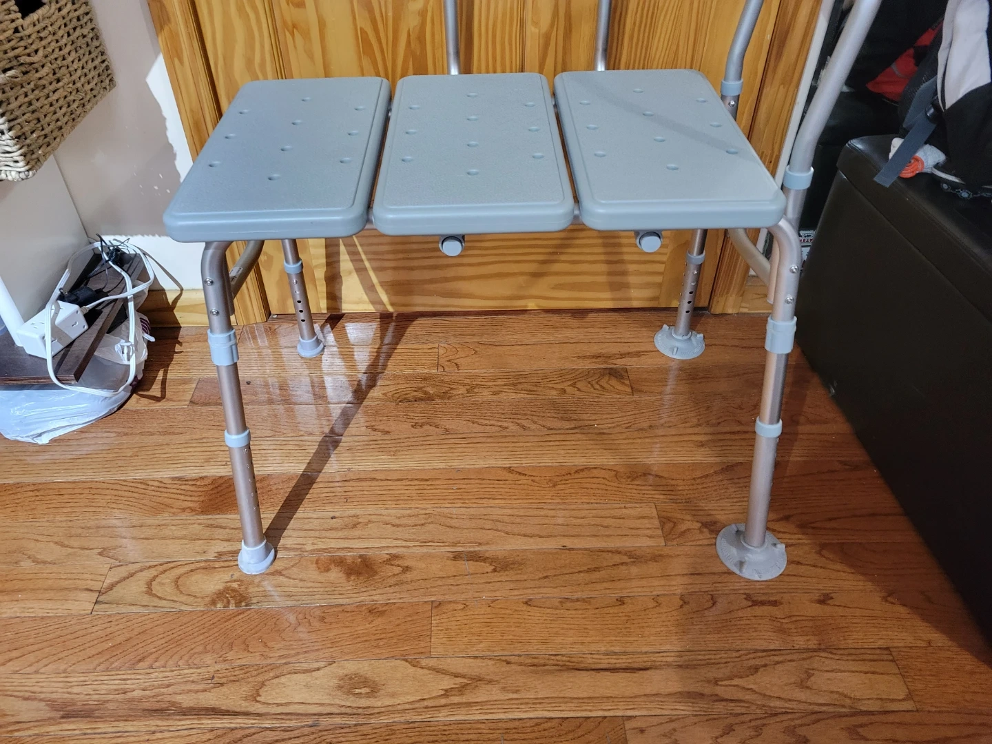 This is a Drive Medical bath transfer bench with a back and armrest. It's made of durable plastic and aluminum. The seat has drainage holes and the legs are adjustable. It provides stability in the shower or tub!