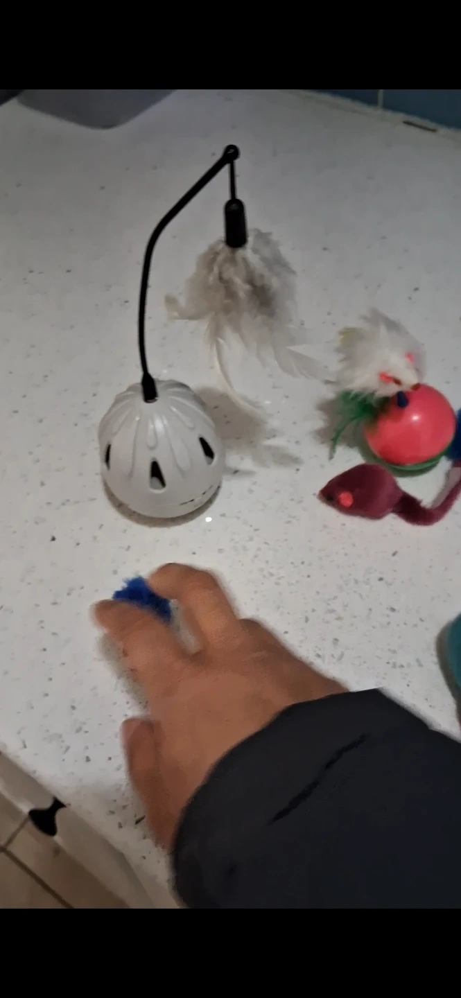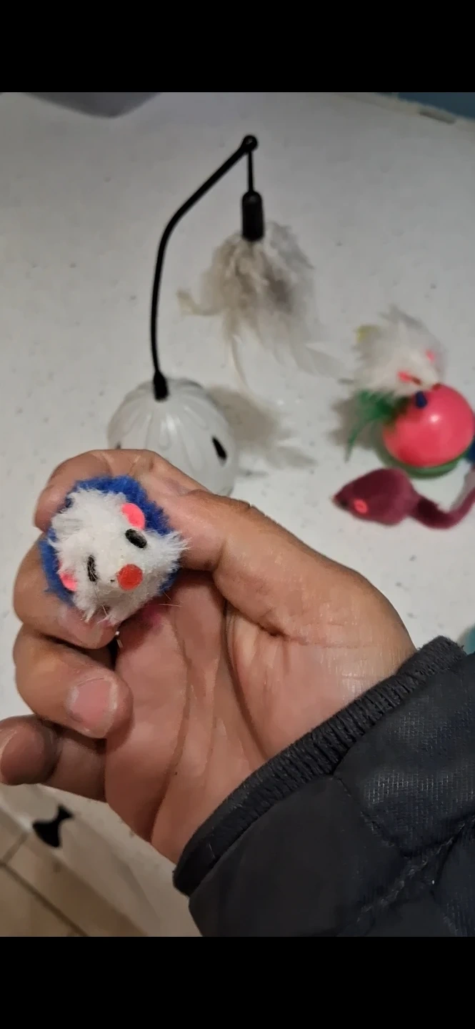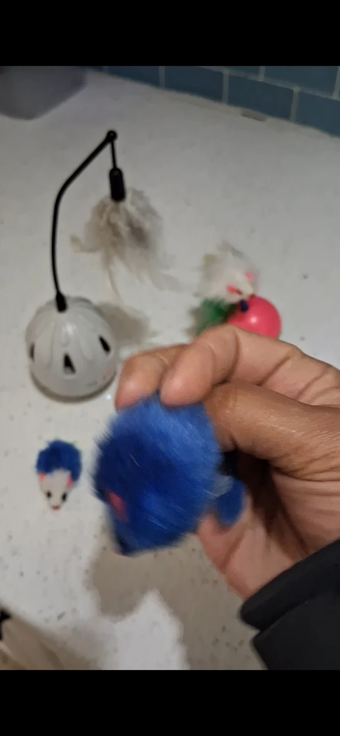 Fun assortment of cat toys for interactive play. Includes a Feather Wand with a base, Plush Mice, and a Fluffy Octopus toy. Great for keeping your feline friend entertained!