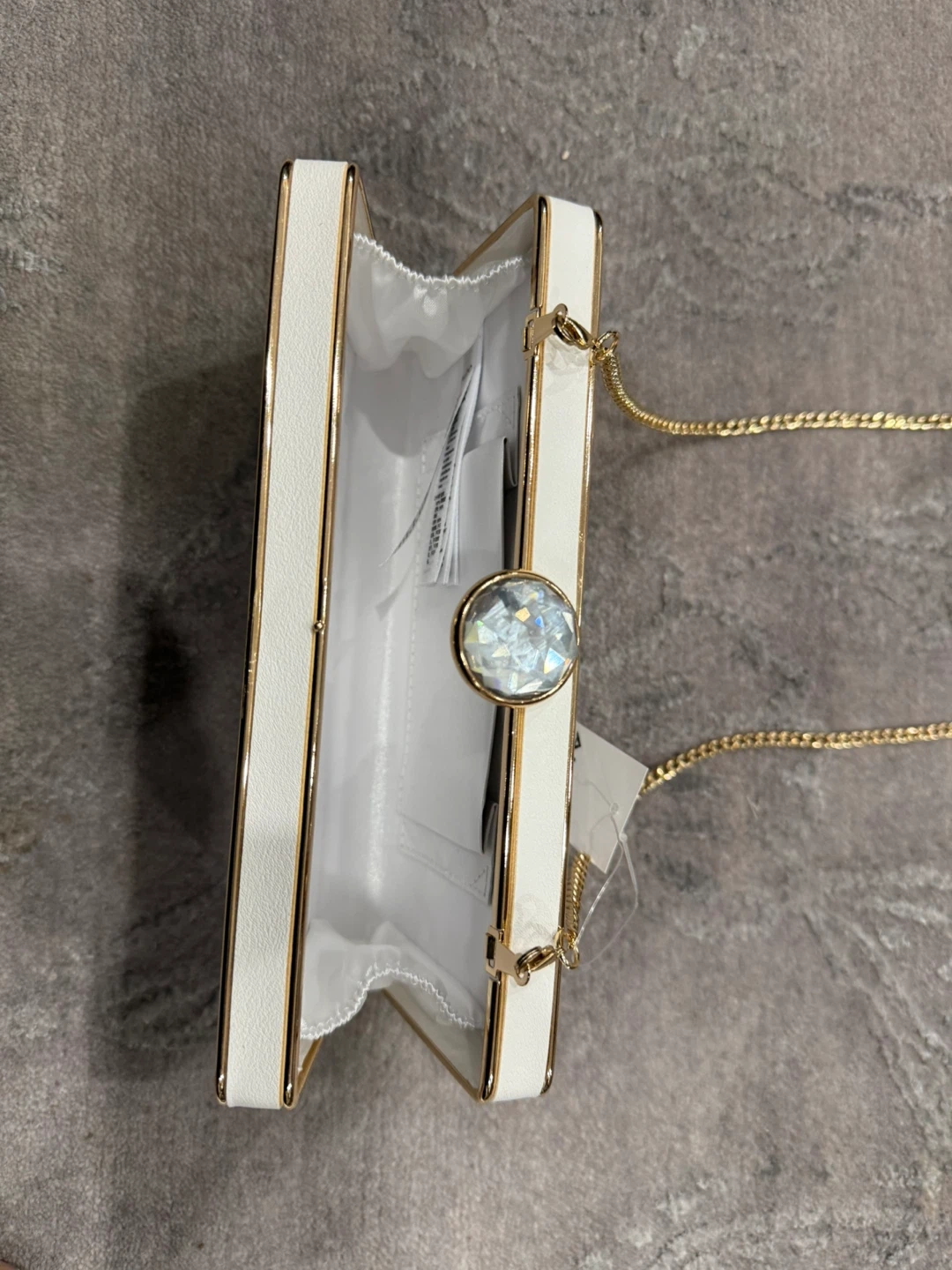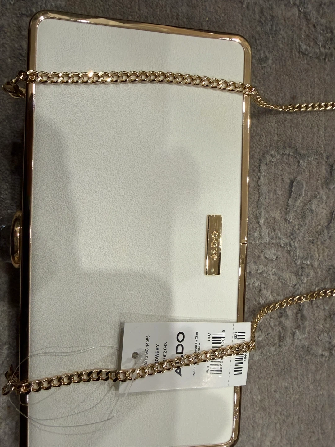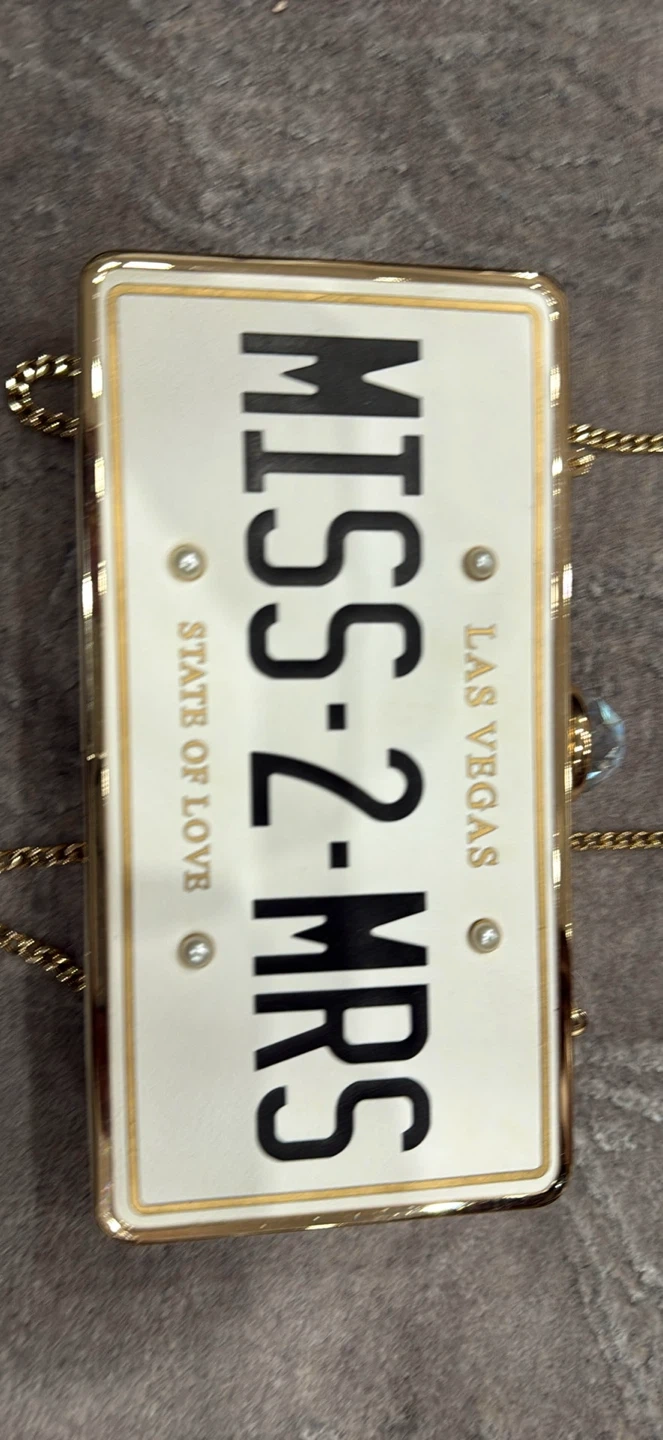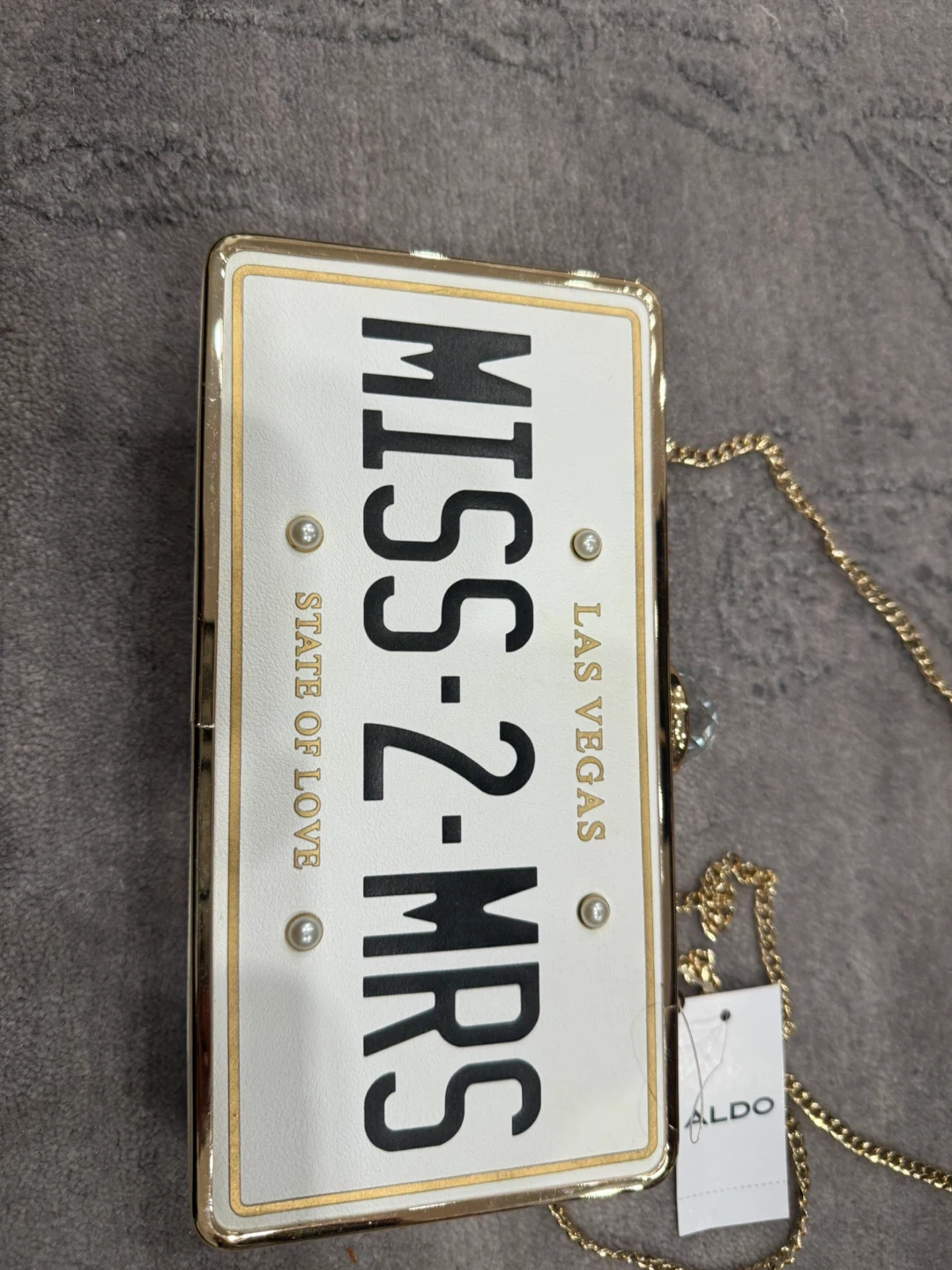 This is an Aldo clutch bag designed to look like a license plate with "Miss-2-Mrs" and "Las Vegas" text. It has a gold chain strap and a decorative gem closure. Perfect for a bachelorette or wedding event!