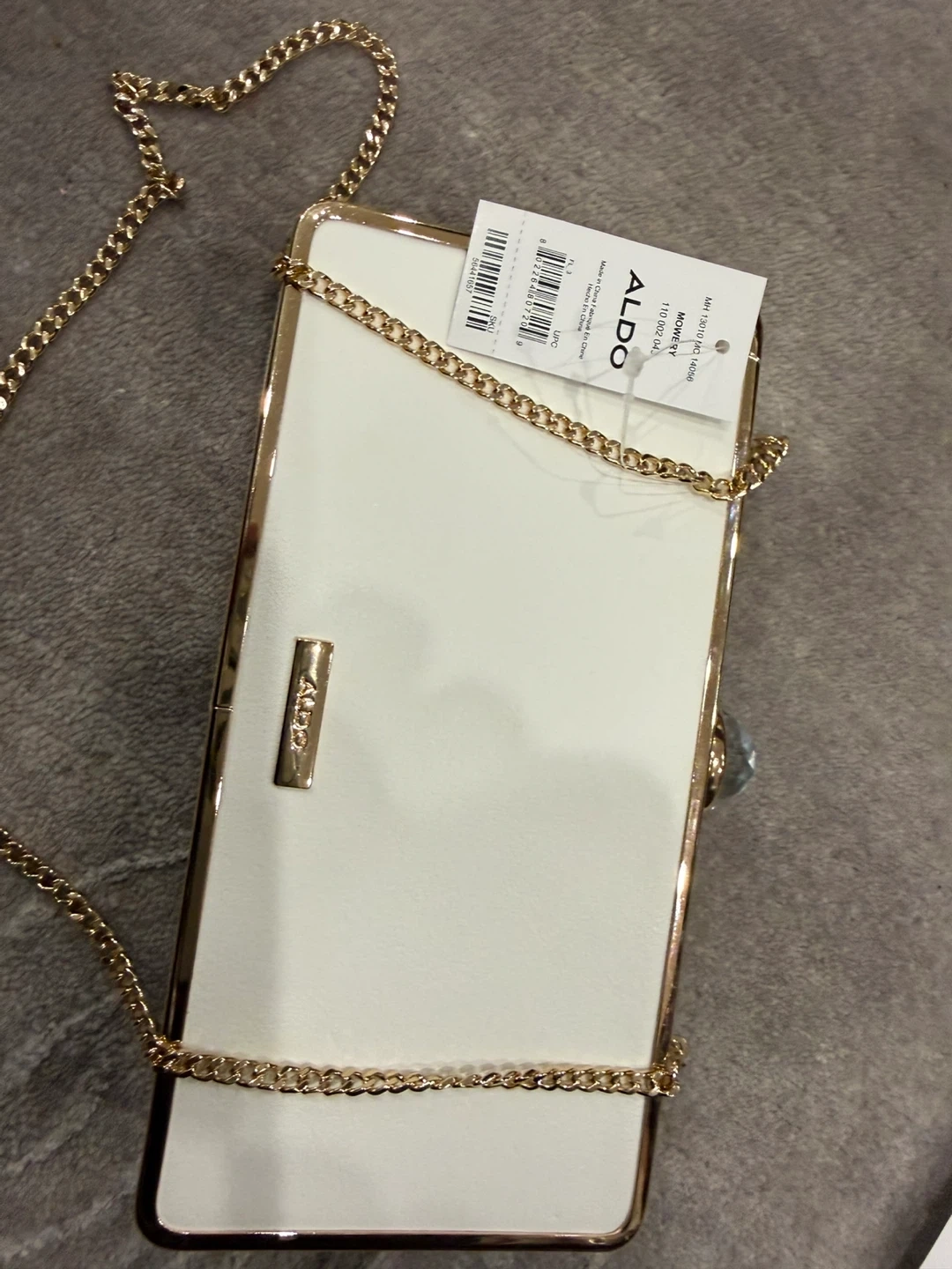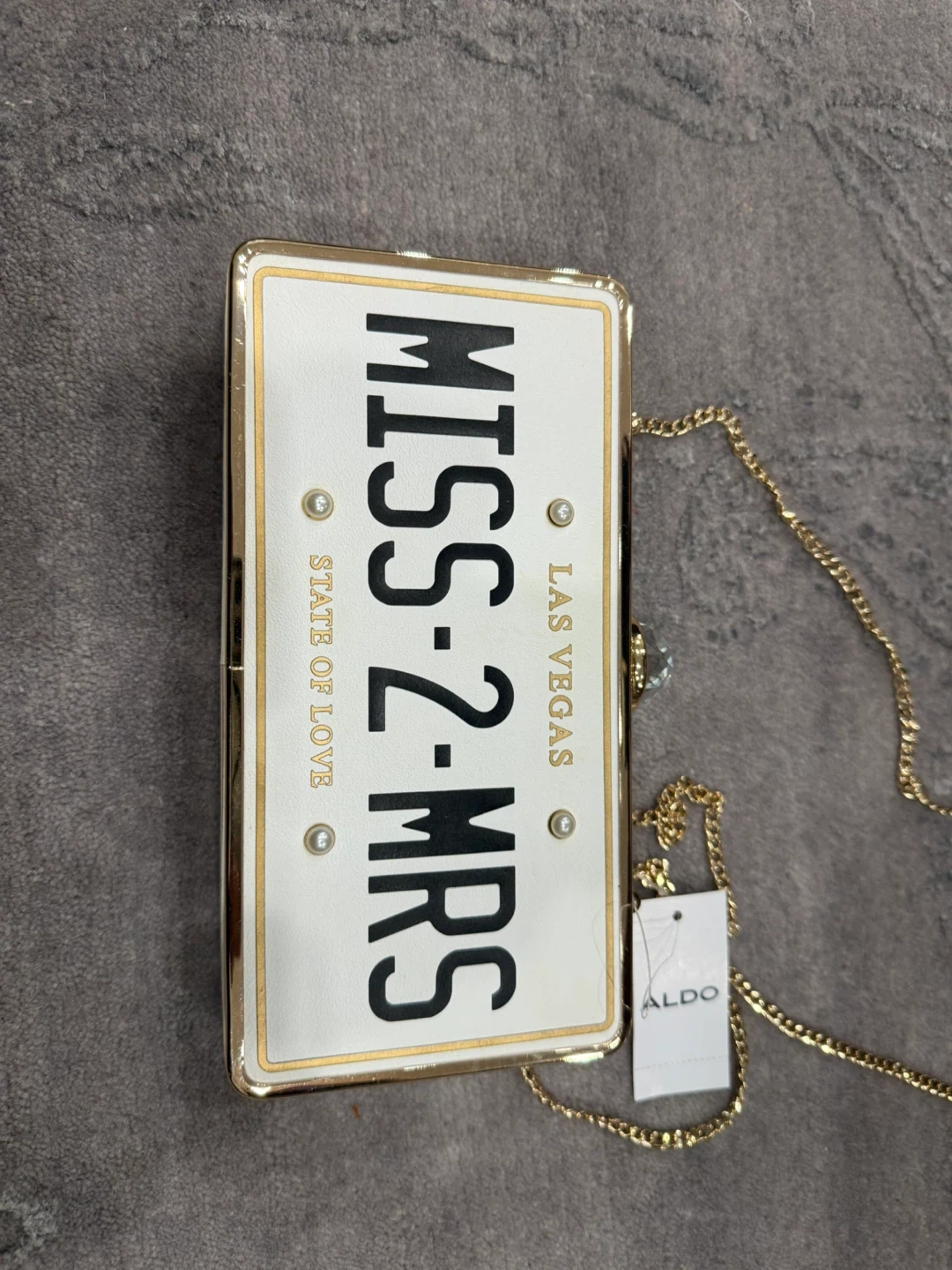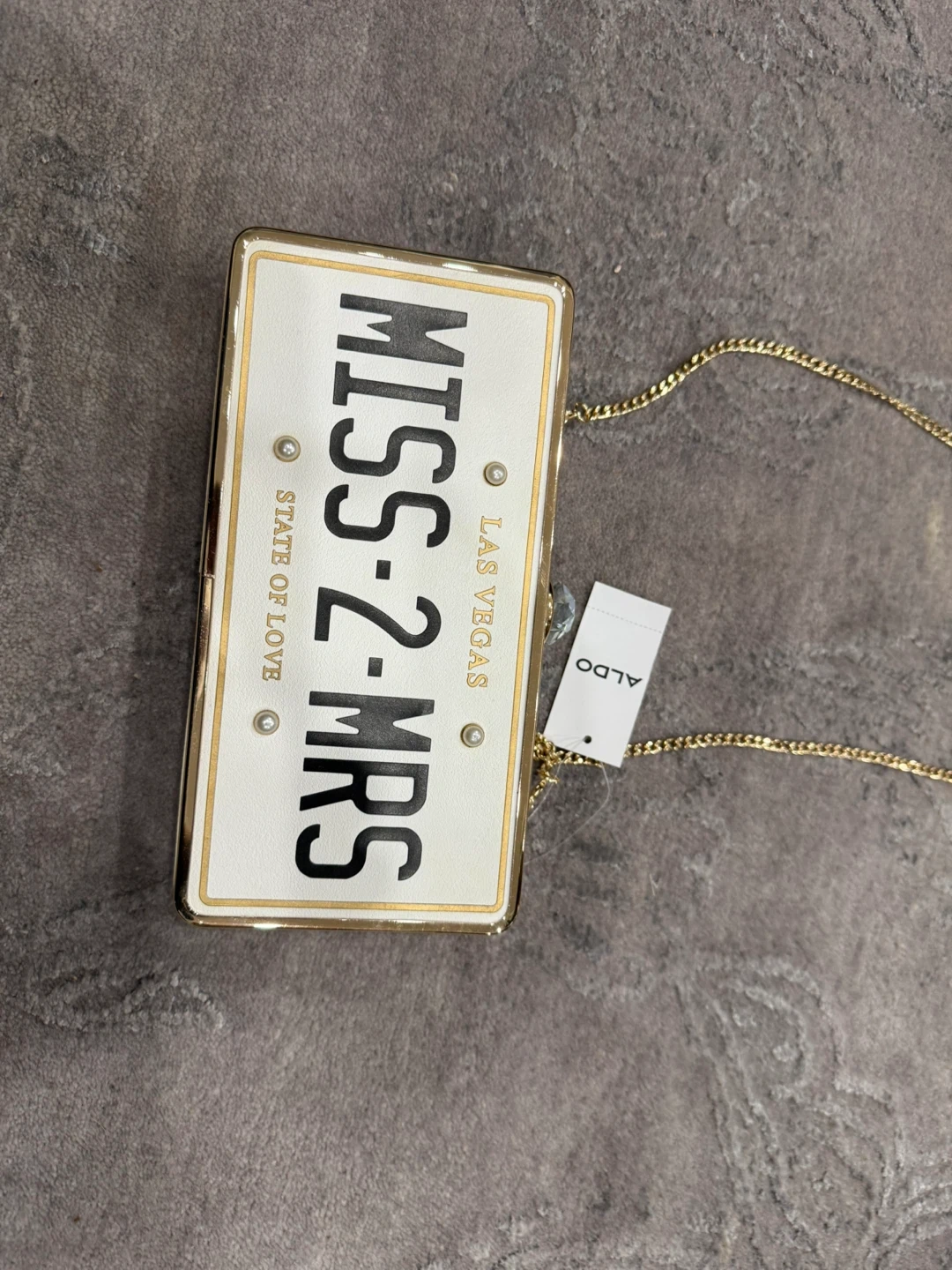 This is an Aldo clutch bag designed to look like a license plate with "Miss-2-Mrs" and "Las Vegas" text. It has a gold chain strap and a decorative gem closure. Perfect for a bachelorette or wedding event!