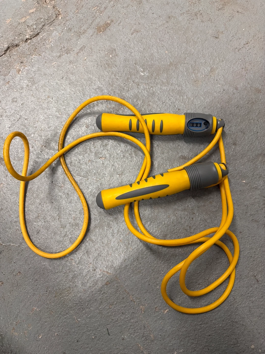 This is a yellow jump rope with a built-in counter in the handle. It's great for tracking your jumps during workouts! The handles are yellow and grey for a comfortable grip.