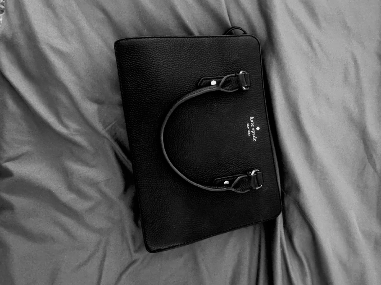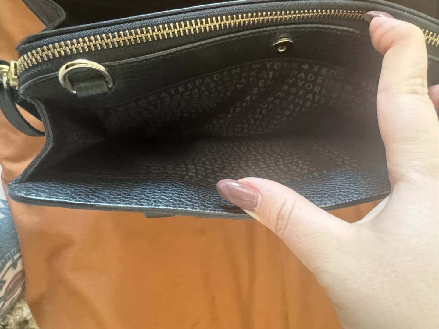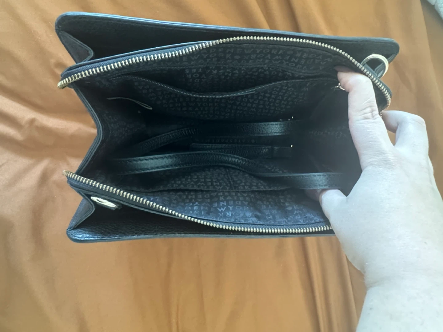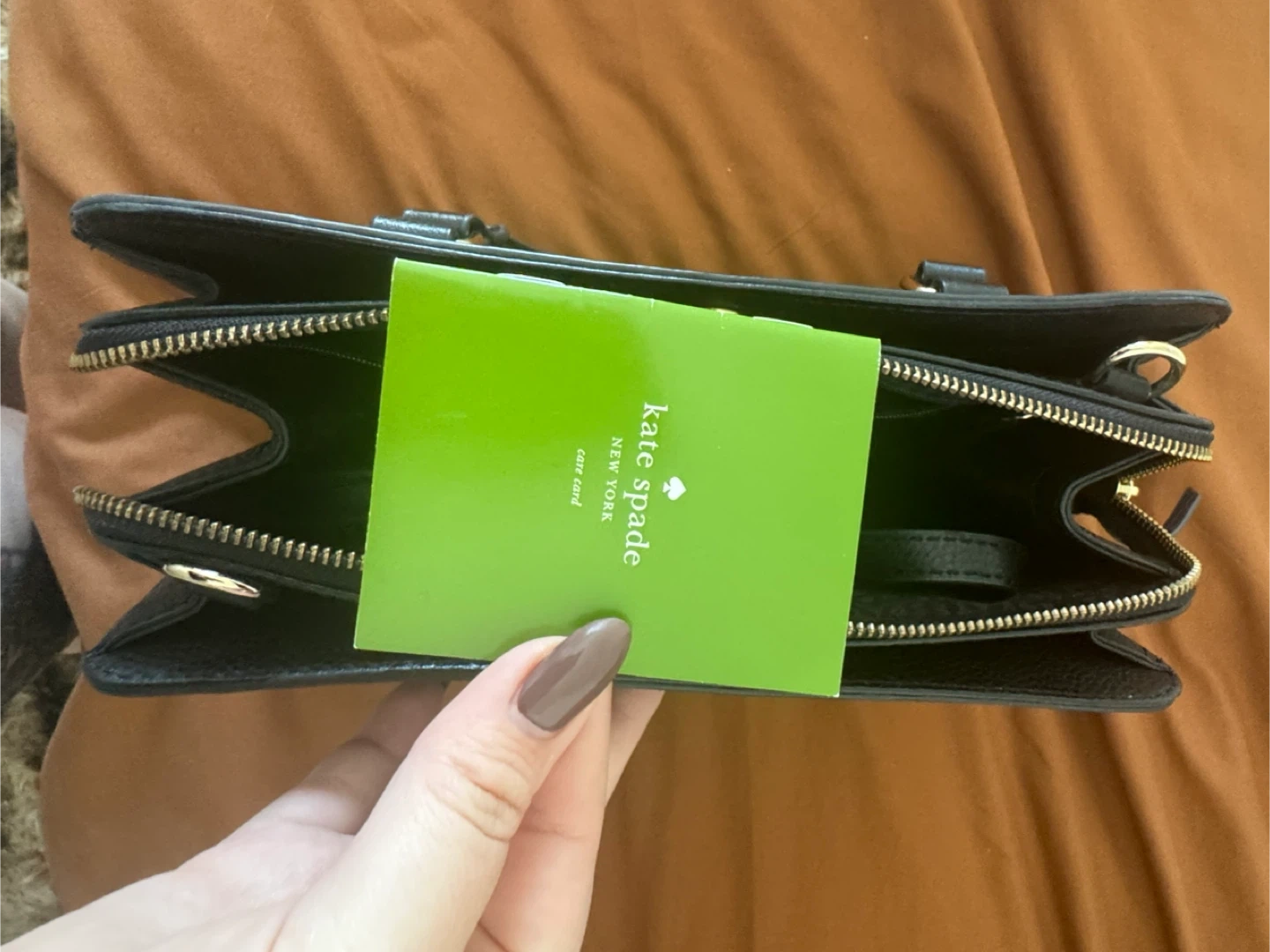 This is a black leather satchel handbag by Kate Spade. It features a zip-around closure and multiple interior pockets. Includes original Kate Spade care card.