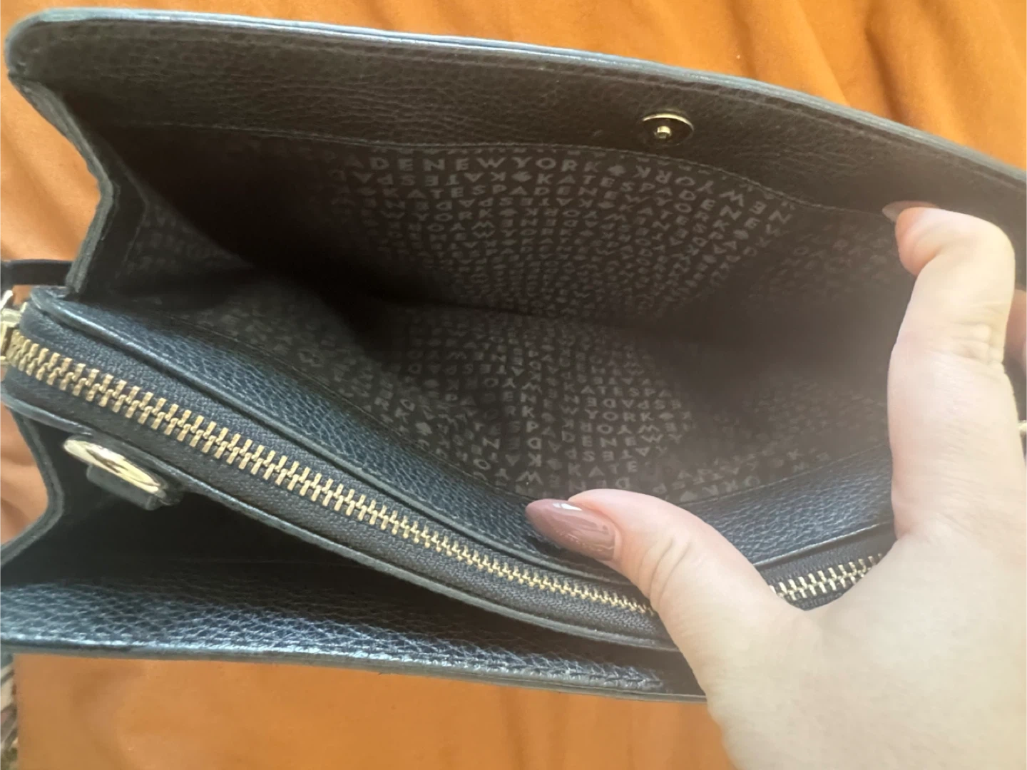 This is a black leather satchel handbag by Kate Spade. It features a zip-around closure and multiple interior pockets. Includes original Kate Spade care card.