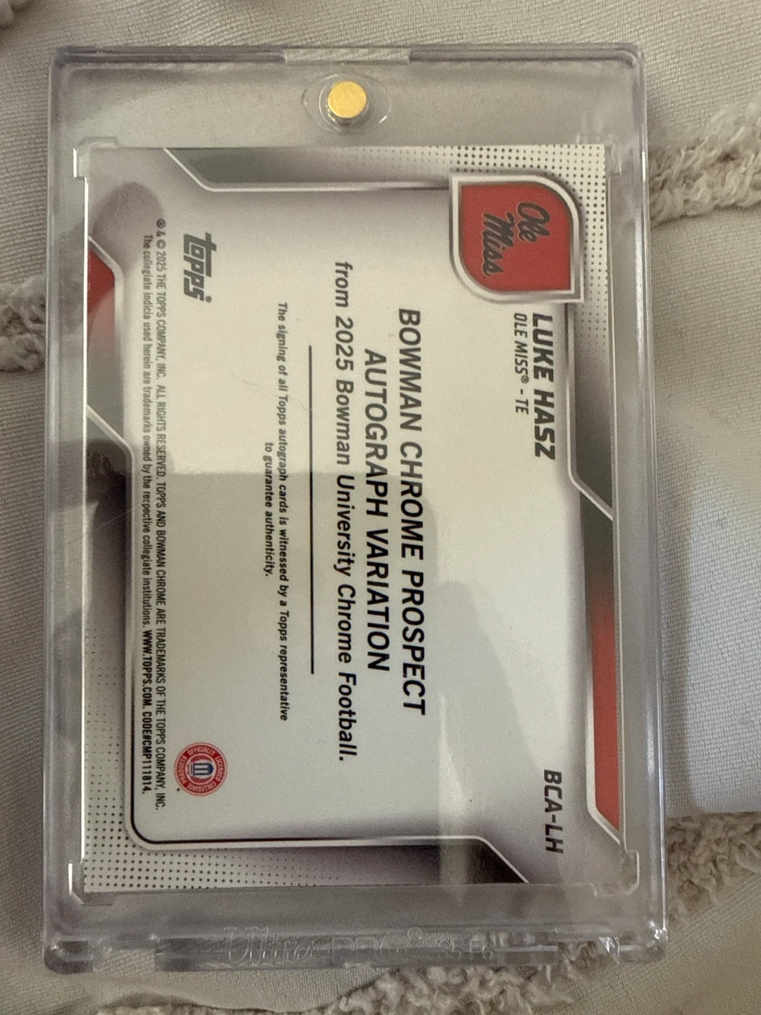 This is a 2025 Topps Bowman Chrome Prospect Autograph Variation trading card for Luke Hasz. It features a certified autograph. The card is from the Ole Miss collection.