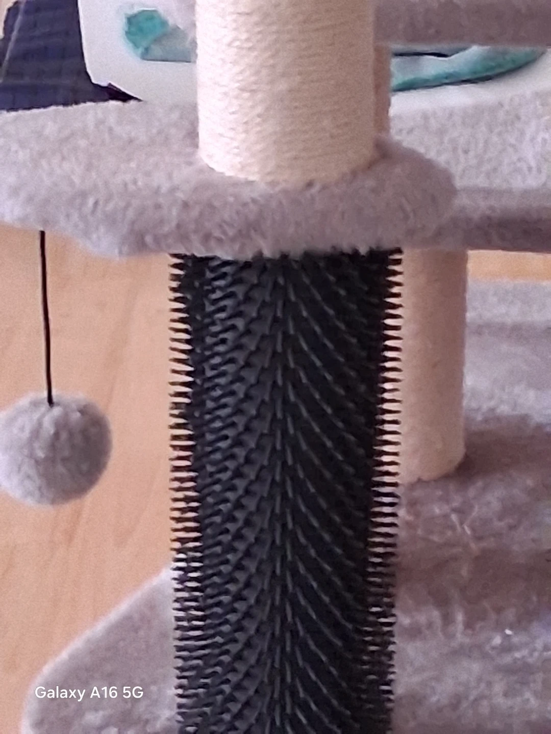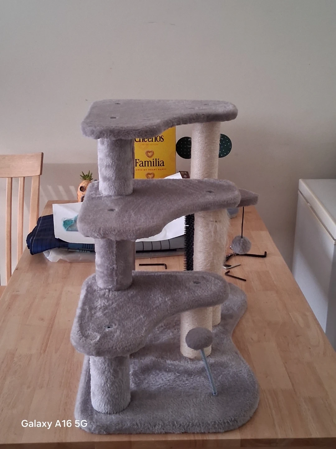 This multi-level cat tree provides scratching posts and platforms for your cat's enjoyment. It's covered in soft gray plush material with sisal-wrapped posts for scratching. Guaranteed to give your feline friend a chance to practice self care, and develop grooming habits. Includes dangling pom-pom toys for added fun!