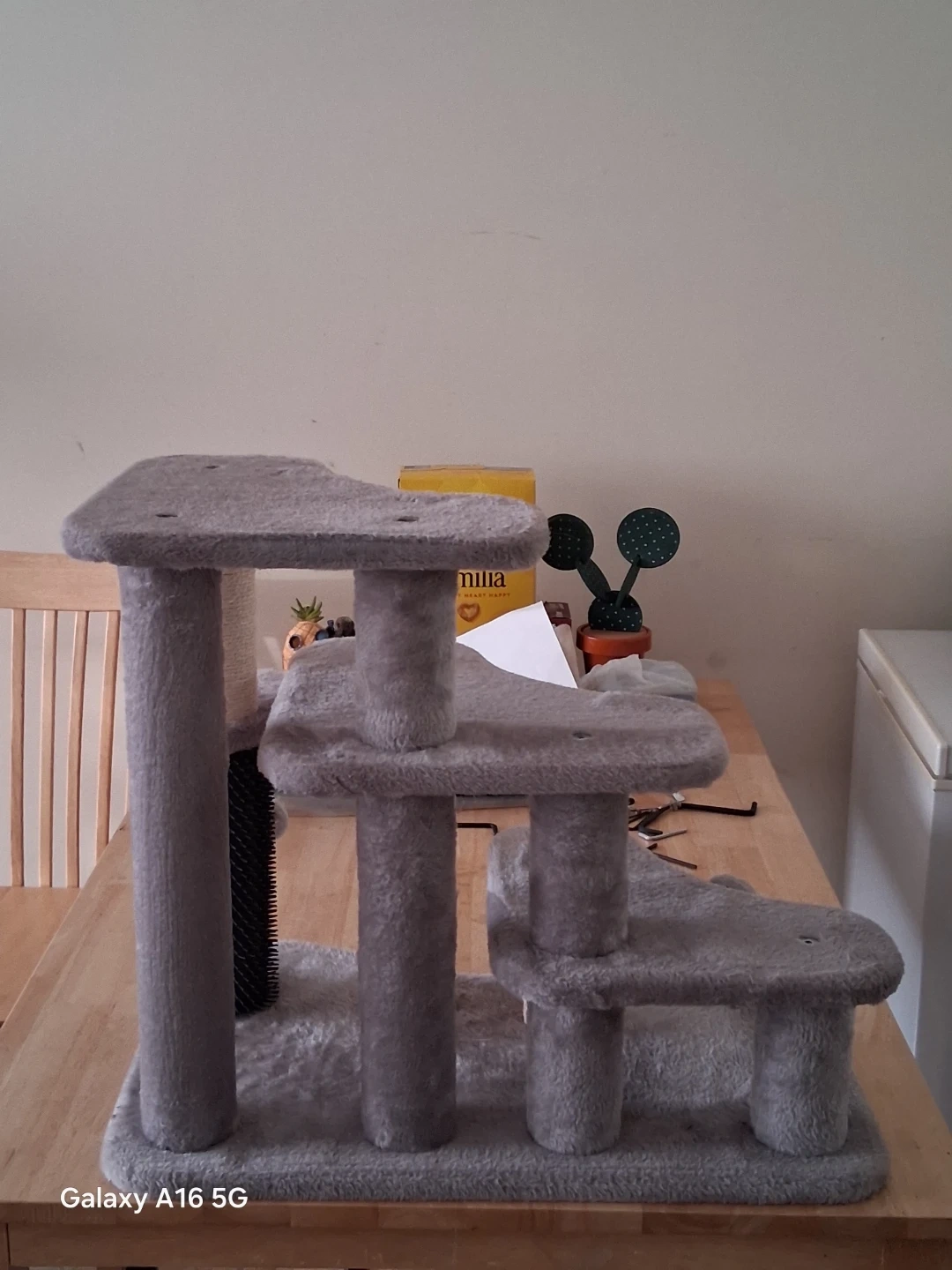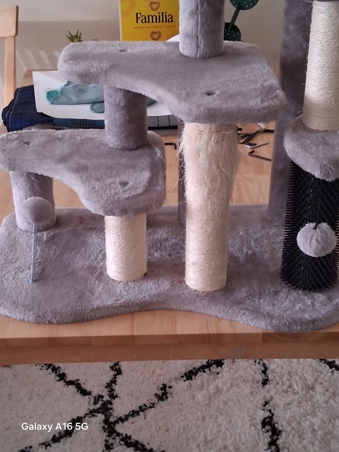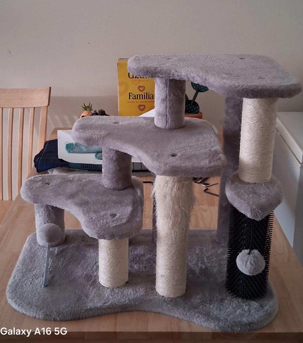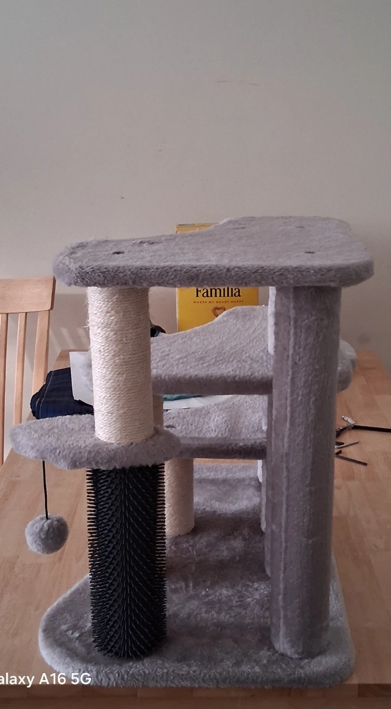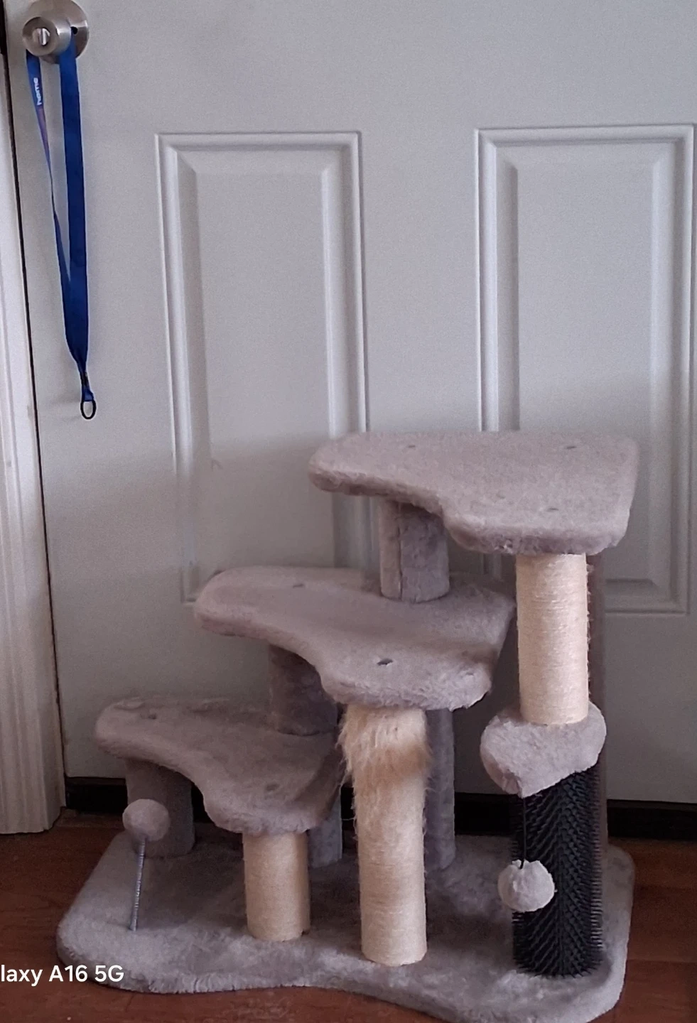 This multi-level cat tree provides scratching posts and platforms for your cat's enjoyment. It's covered in soft gray plush material with sisal-wrapped posts for scratching. Guaranteed to give your feline friend a chance to practice self care, and develop grooming habits. Includes dangling pom-pom toys for added fun!