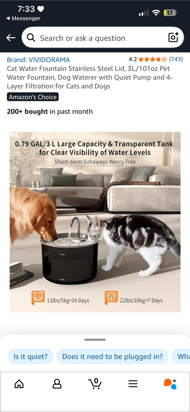 This is the VIVIDORAMA Cat Water Fountain with a 3L capacity. It's made with a stainless steel lid and has a quiet pump. The 4-layer filtration system keeps water fresh. Its new and unused