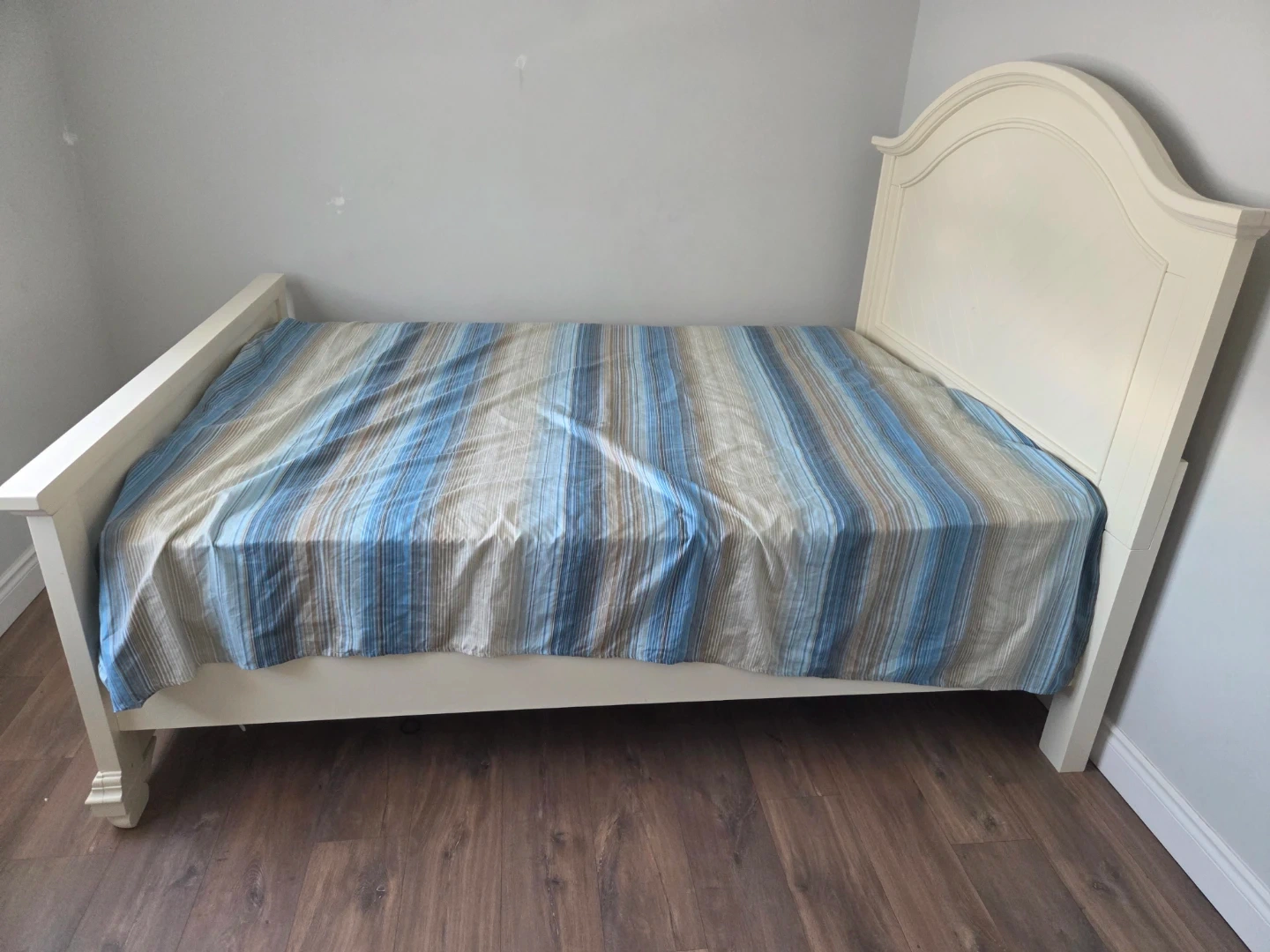 This is a classic white queen bed frame with a headboard and footboard. It features decorative paneling on the footboard and a gently curved headboard. The frame is sturdy and made of wood. It's perfect for a child's room or guest bedroom.