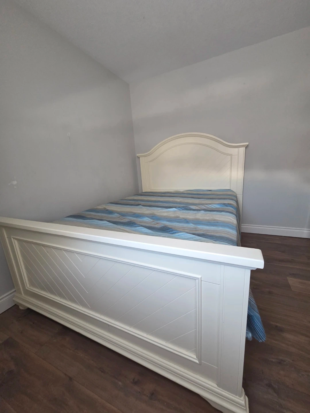 This is a classic white queen bed frame with a headboard and footboard. It features decorative paneling on the footboard and a gently curved headboard. The frame is sturdy and made of wood. It's perfect for a child's room or guest bedroom.