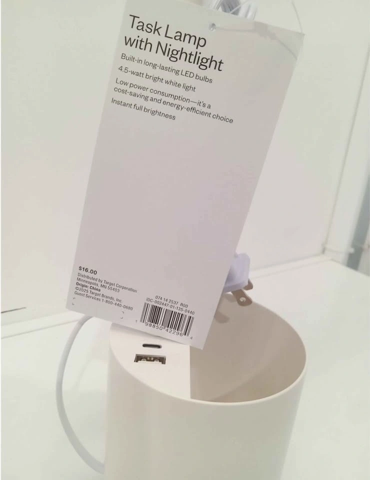 Bright Room Essentials task lamp with a built-in nightlight. It has USB-A and USB-C ports in the base for charging devices. The LED light is 4.5-watt bright white. It also has a small organizer spot in the base for pens or other small items. Energy efficient and great for a desk or bedside.