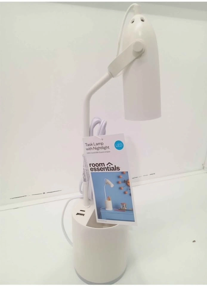 Bright Room Essentials task lamp with a built-in nightlight. It has USB-A and USB-C ports in the base for charging devices. The LED light is 4.5-watt bright white. It also has a small organizer spot in the base for pens or other small items. Energy efficient and great for a desk or bedside.