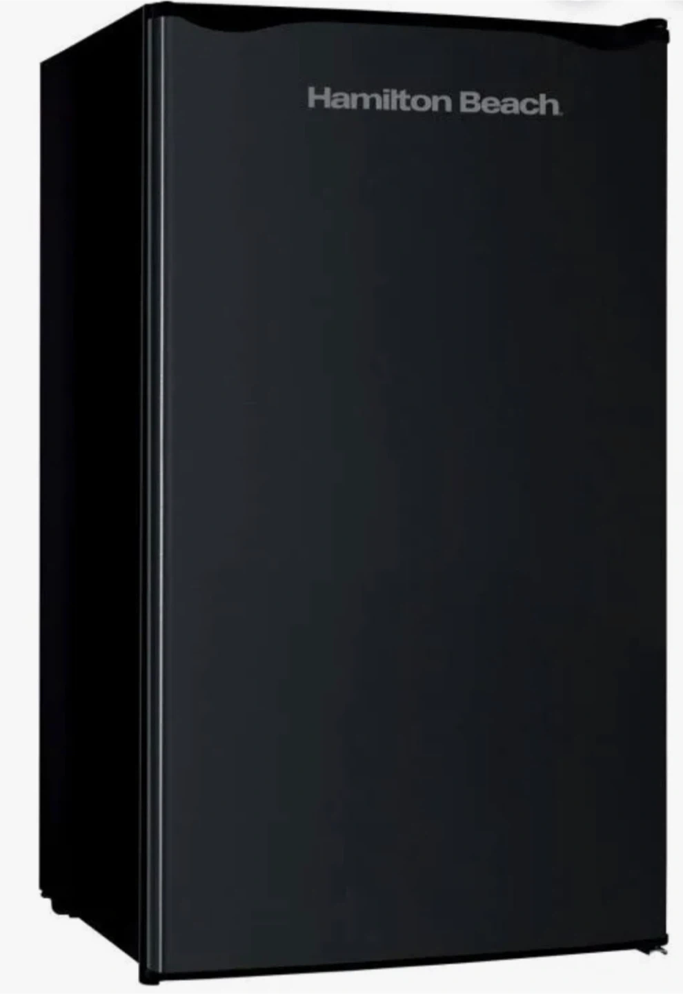 Hamilton Beach mini fridge in black. It's a compact and handy appliance for keeping drinks and snacks cool. This fridge is great for dorm rooms, offices, or small living spaces.