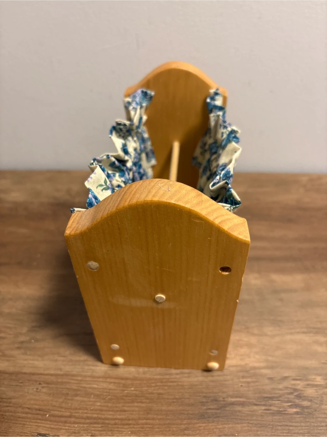 This charming wooden mail sorter features a floral fabric lining. It's perfect for organizing letters and documents on a desk or entryway table. The wood frame has a natural finish and includes a decorative 'MAIL' heart charm.