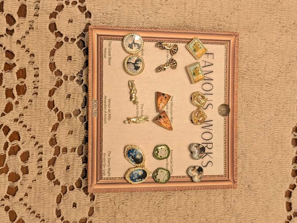 Cool set of 7 pairs stud earrings, each featuring a mini famous artwork. Designs include The Great Wave, Venus de Milo, The Kiss, Vitruvian Man, Sunflowers, Starry Night, and American Gothic. All nickel free. Great for art lovers.