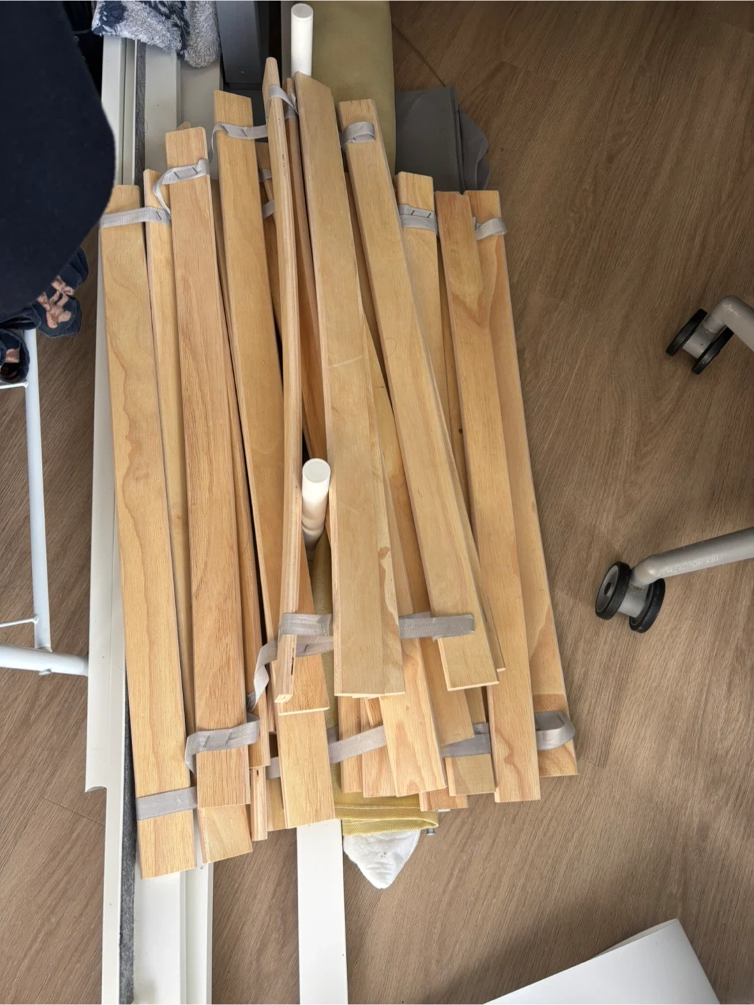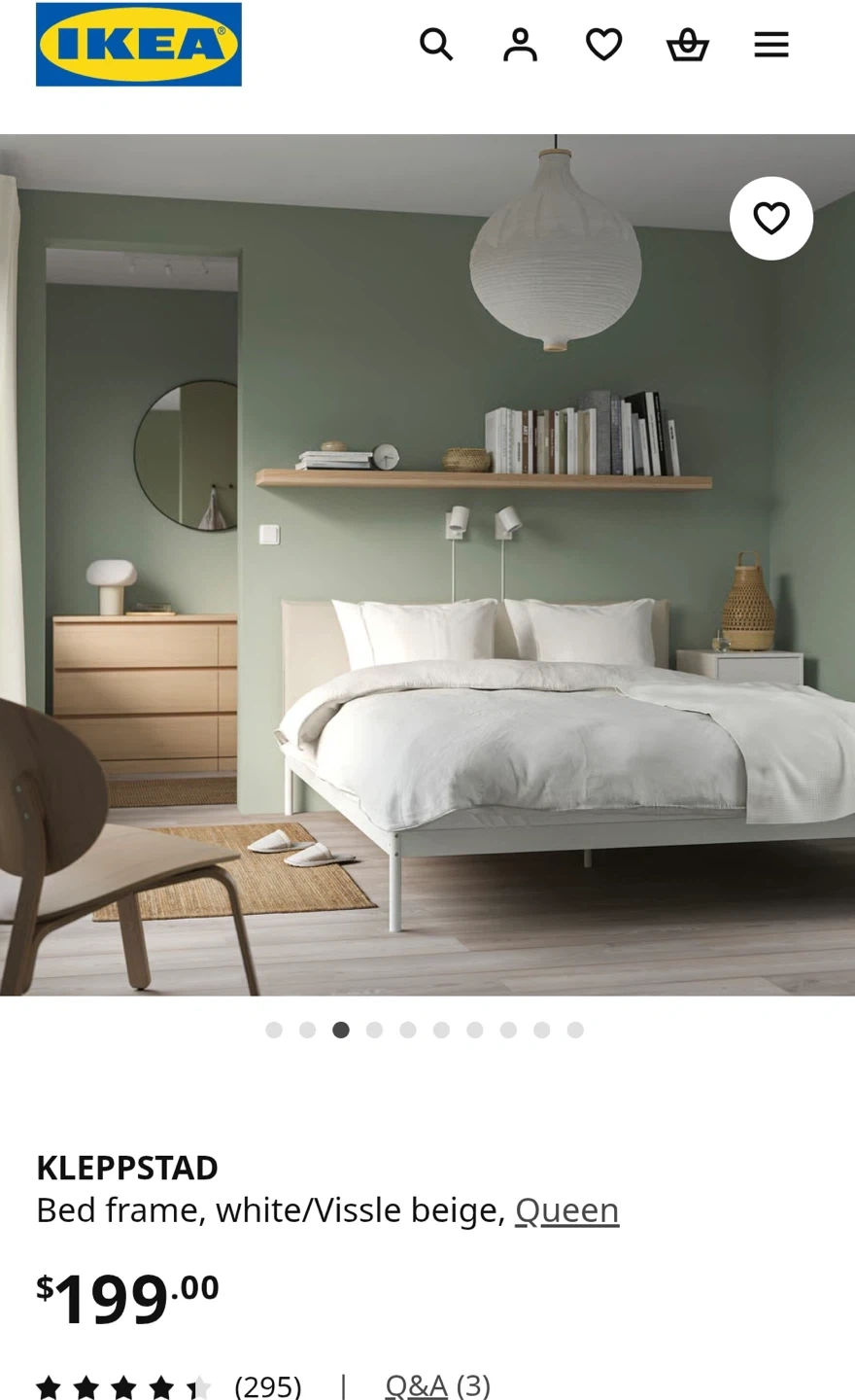 This is the IKEA KLEPPSTAD bed frame in Queen size. It's white with Vissle beige accents. The frame's design offers a simple and modern look for any bedroom.