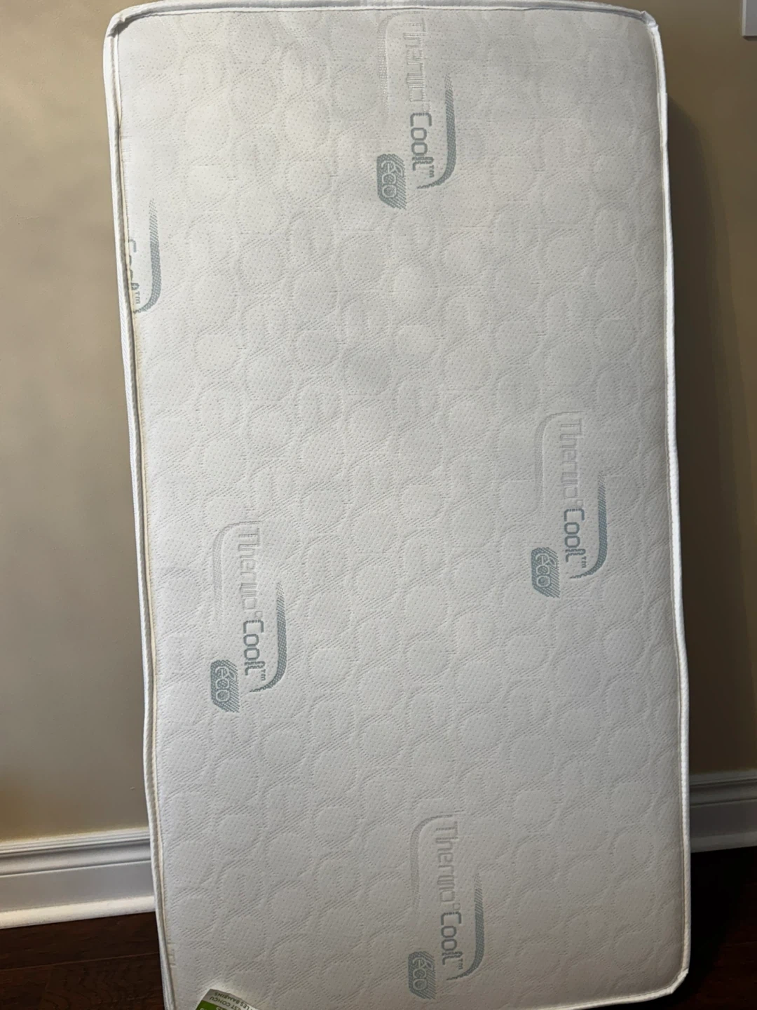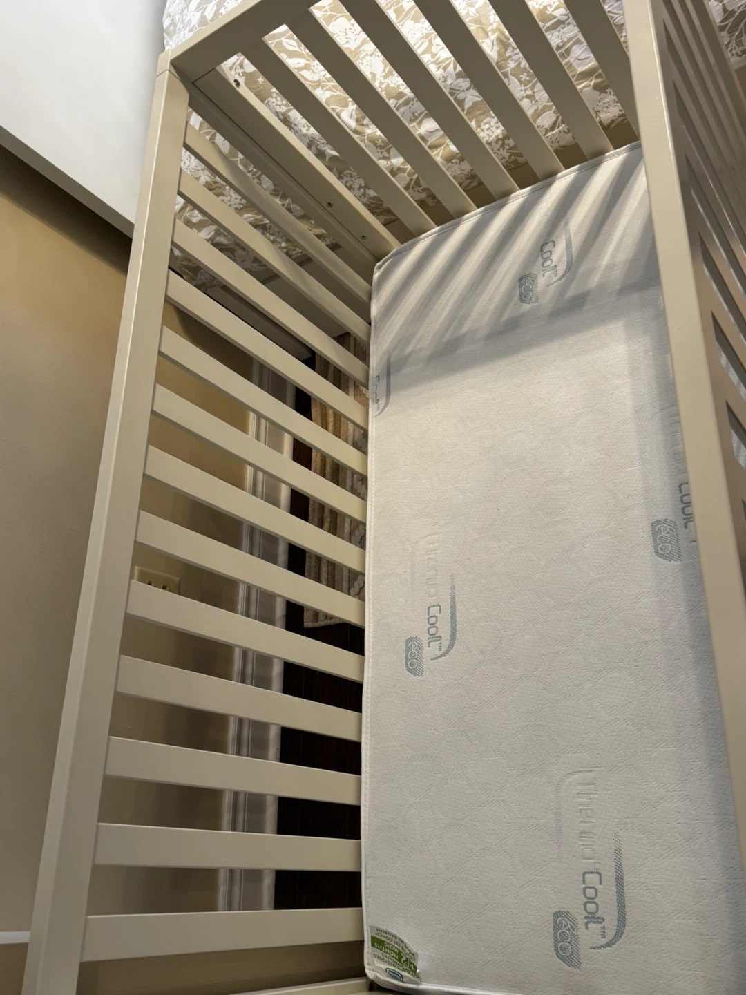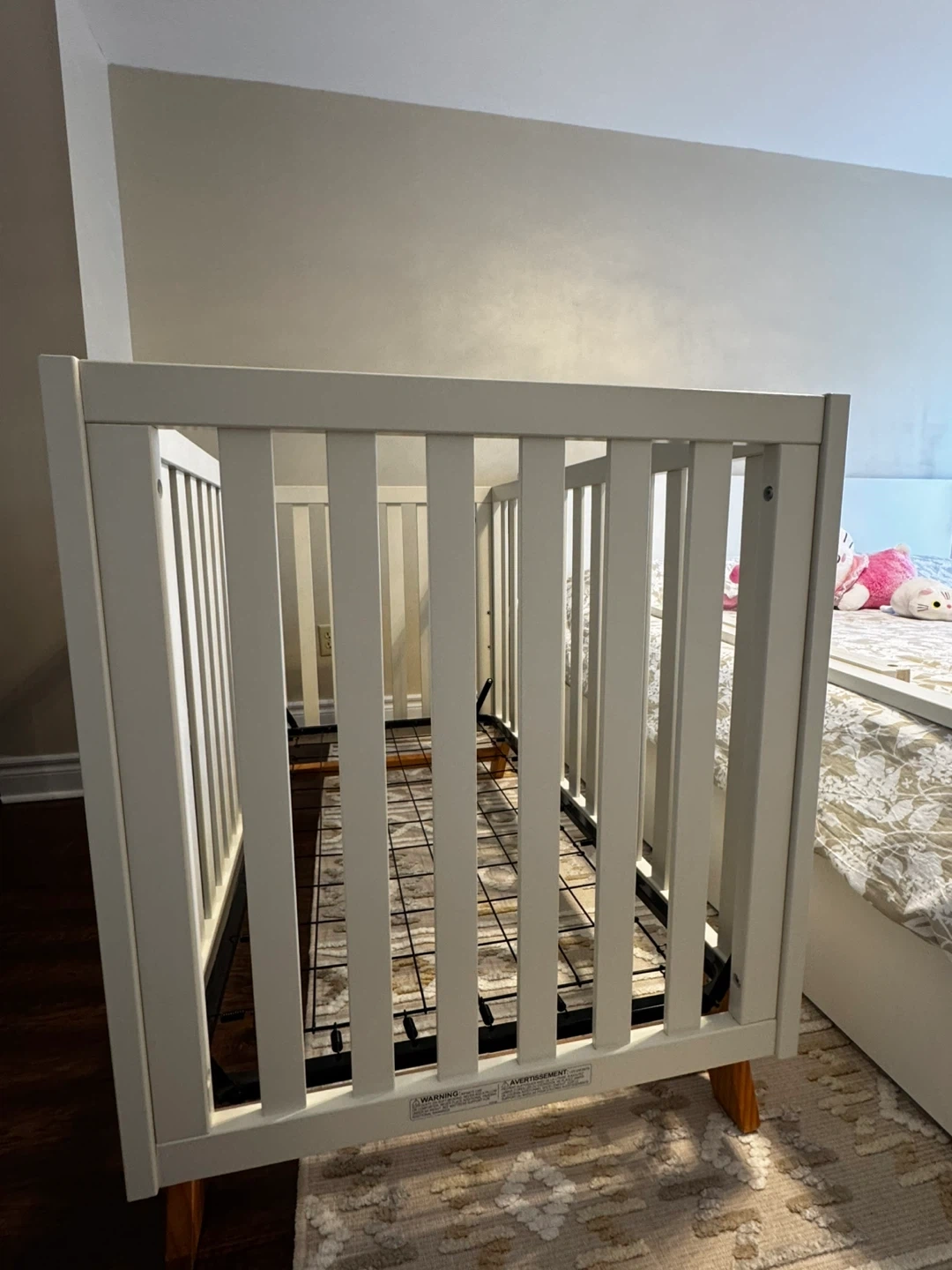 White wooden Child Craft crib with a metal mattress support. This crib is designed for infants- toddler phase. It has sturdy wooden legs and 3 height level options. Light weight to move around. Mattres with 2 side for infant and toddler with cooling design, never used before. Crib musical mobile, bed sheet and mattress protector for free.