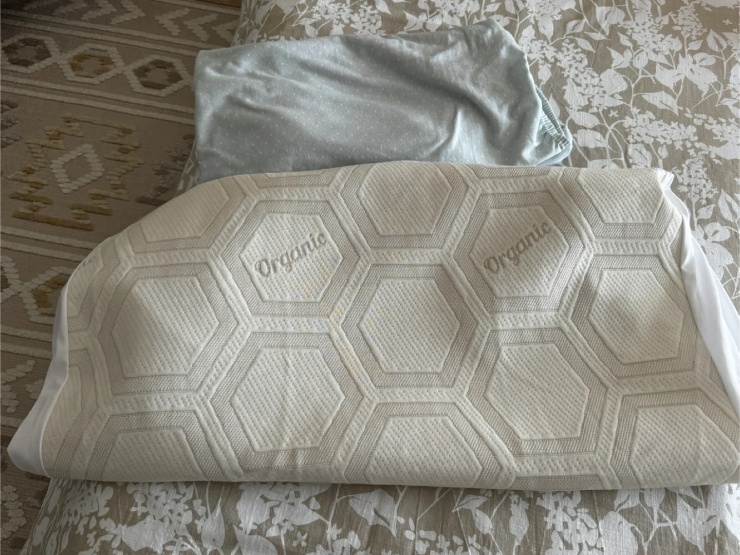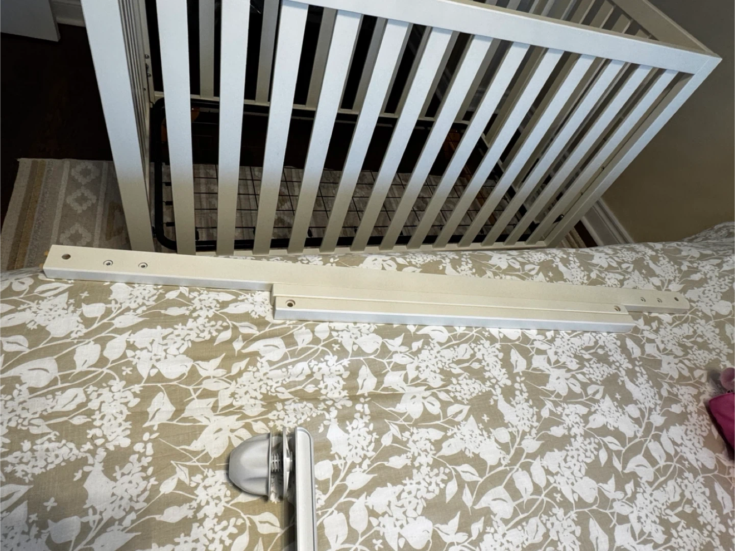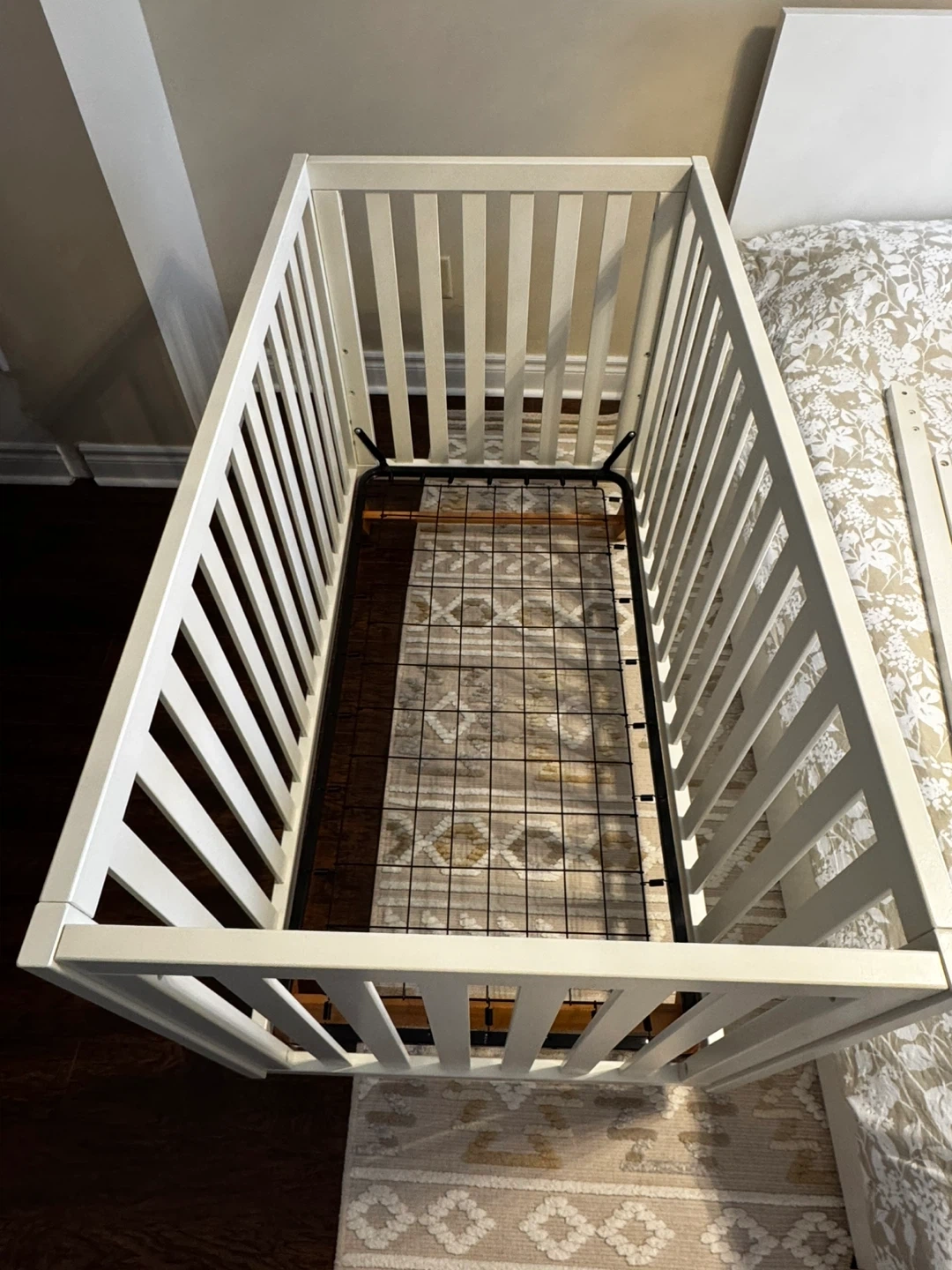 White wooden Child Craft crib with a metal mattress support. This crib is designed for infants- toddler phase. It has sturdy wooden legs and 3 height level options. Light weight to move around. Mattres with 2 side for infant and toddler with cooling design, never used before. Crib musical mobile, bed sheet and mattress protector for free.