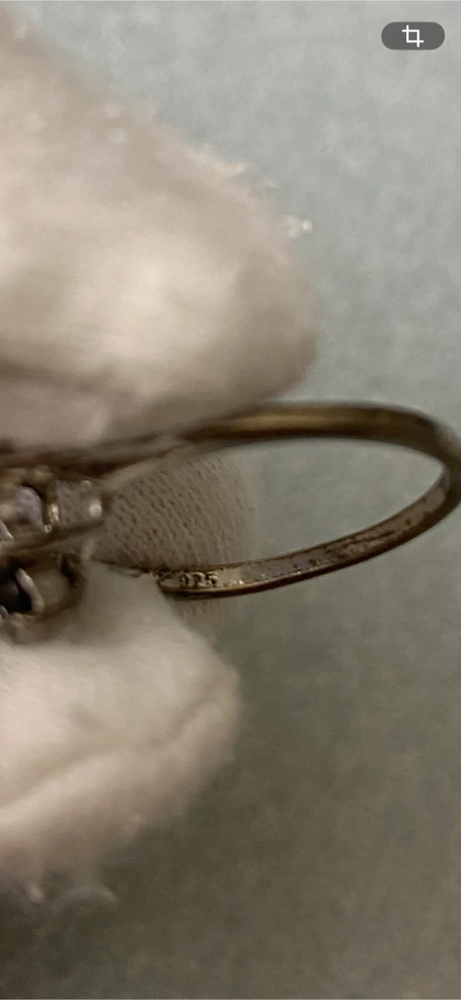 Sterling silver ring featuring a cluster of black sapphires and clear cubic zirconia stones. It's marked 925 for sterling silver content. This ring would be a nice addition to any jewellery collection. Has initial R.J and 925 inside ring. Has a bit of wear on it can be polished.