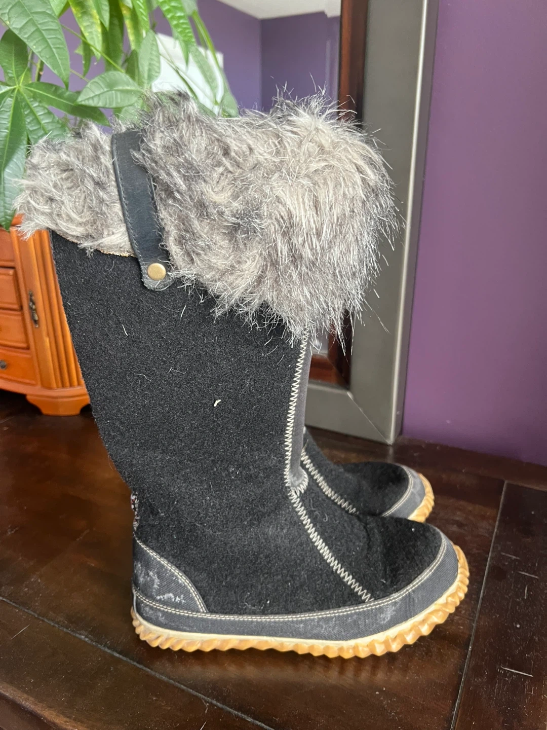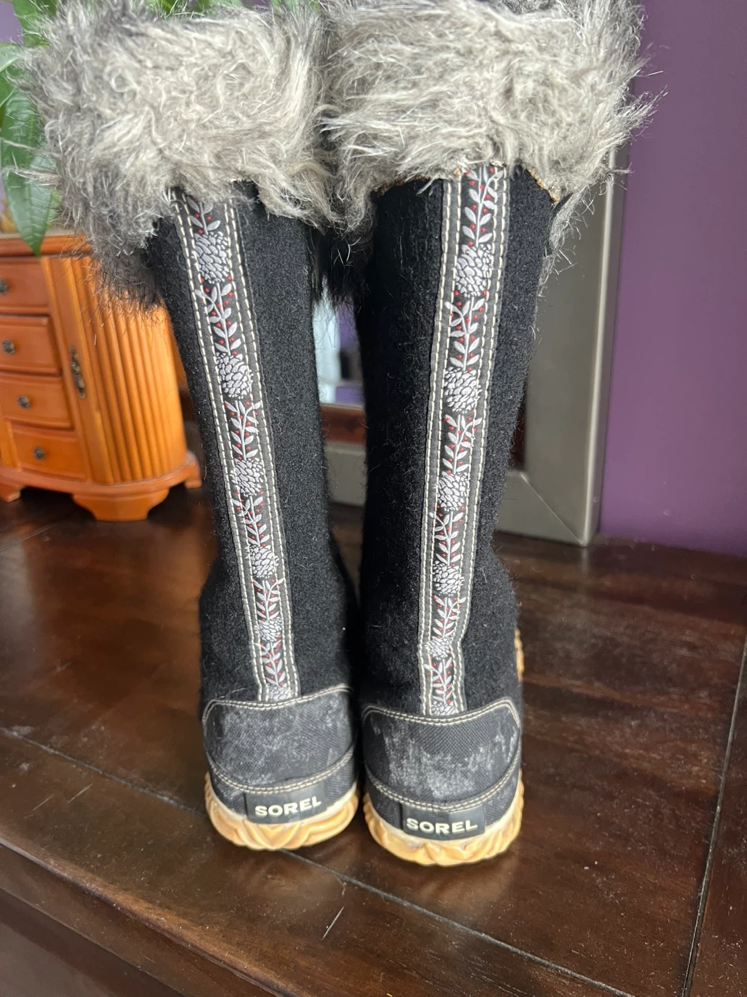 Cozy Sorel winter boots with a black felted exterior and fluffy grey fur trim. They have a durable rubber sole with a distinctive tread pattern for traction. The decorative stitching adds a nice touch.