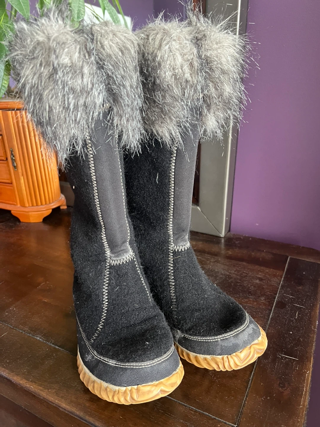 Cozy Sorel winter boots with a black felted exterior and fluffy grey fur trim. They have a durable rubber sole with a distinctive tread pattern for traction. The decorative stitching adds a nice touch.