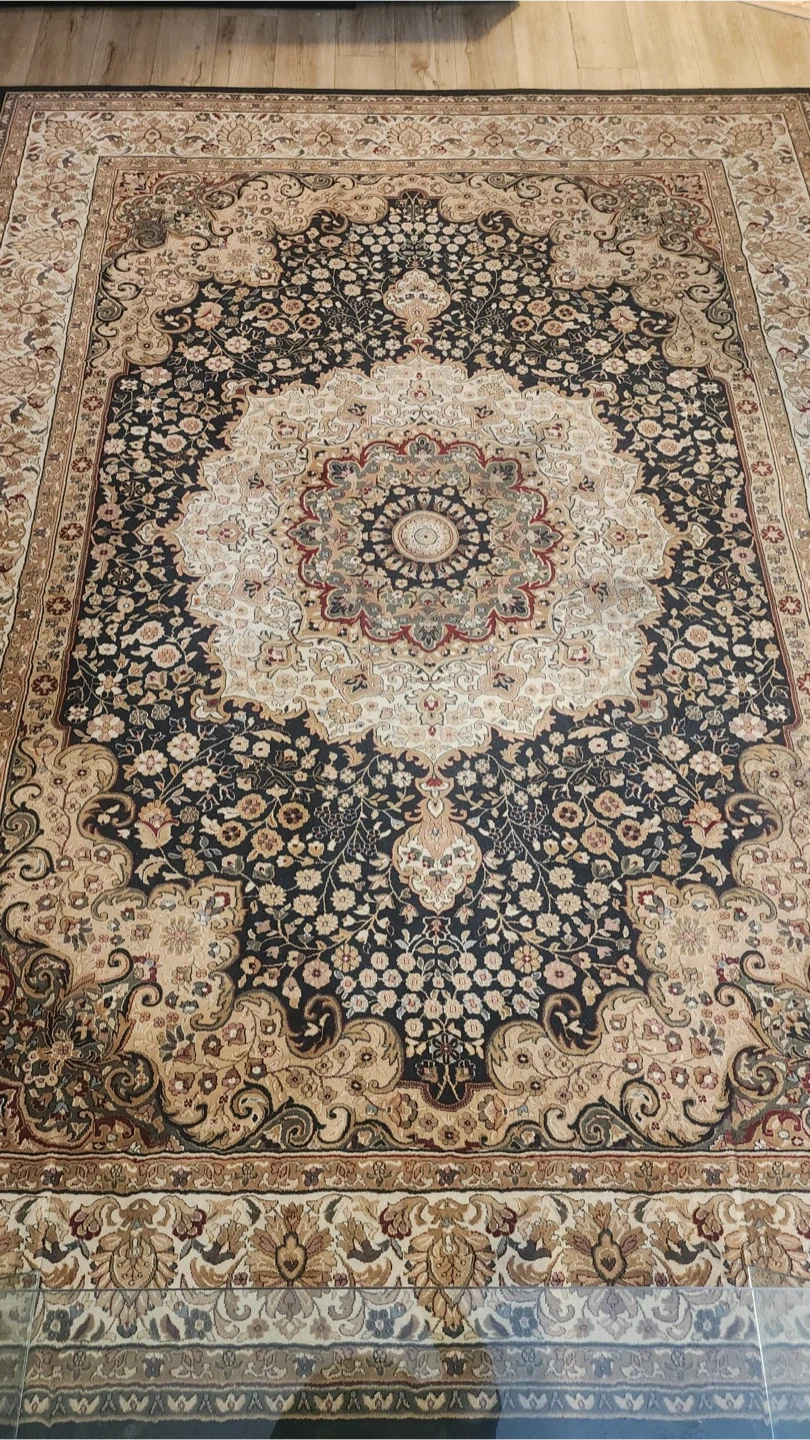 Beautifully designed area rug with intricate floral patterns. Features a traditional Persian style in a black, beige color scheme. Adds elegance to any room!