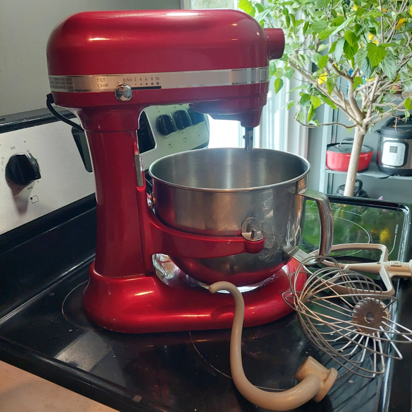 This is a red KitchenAid stand mixer. It comes with a stainless steel bowl, dough hook, and whisk attachment. It's a great appliance for any kitchen!