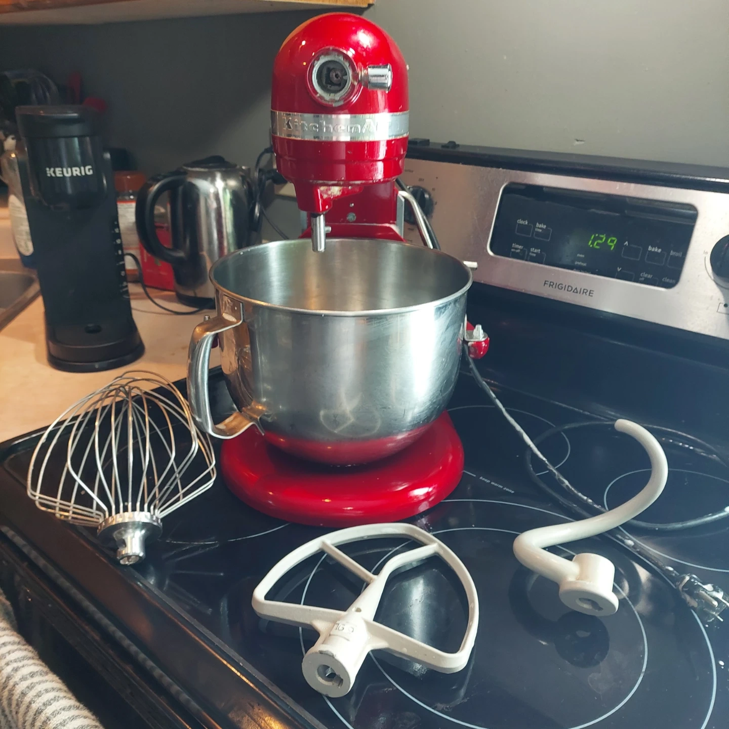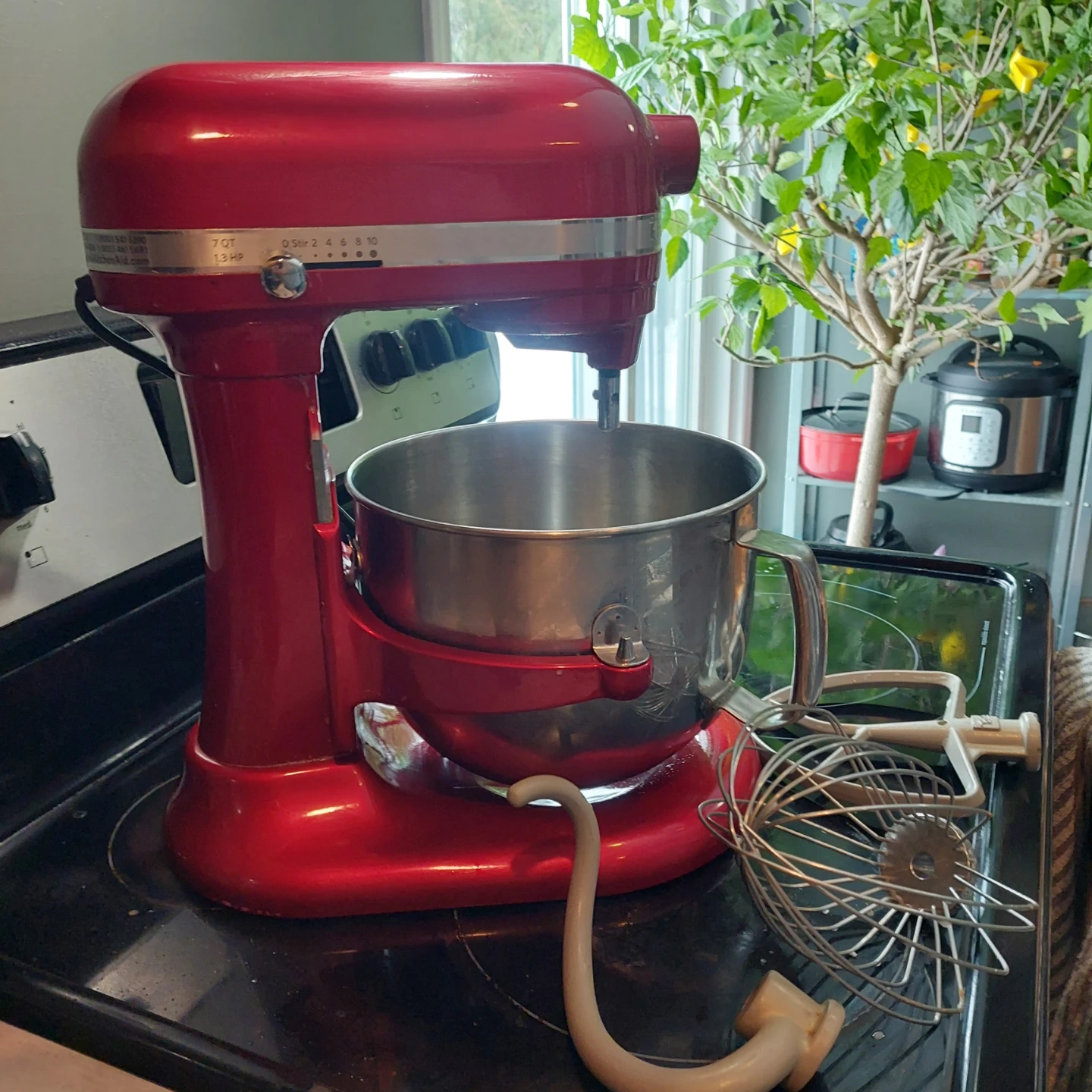 This is a red KitchenAid stand mixer. It comes with a stainless steel bowl, dough hook, and whisk attachment. It's a great appliance for any kitchen!